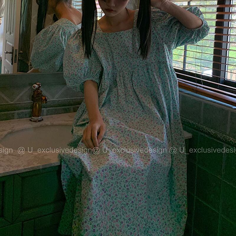 フローラルドレス サマースタイルスリーブルーズ薄手Aラインスカート 夏物 花柄 スクウェア ビッグFスモールZ韓国15922698483