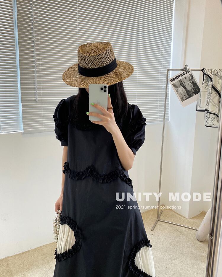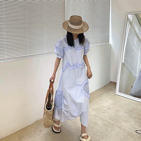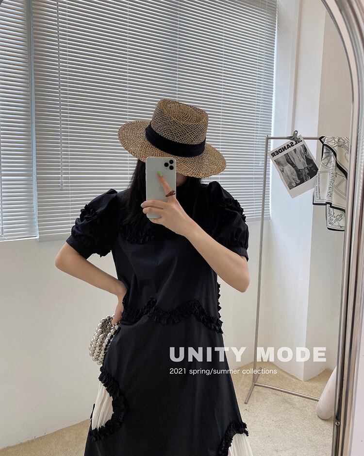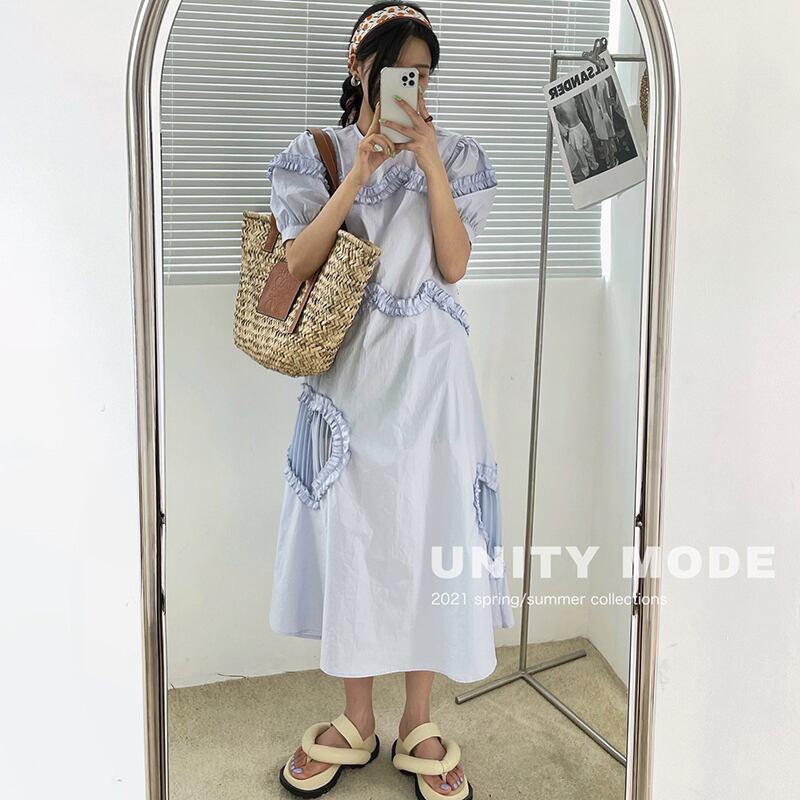ドレス サマープリーツAラインラウンドネックスリーブロングスカート 夏物 Oネック ビッグFスモールZ韓国88997433928