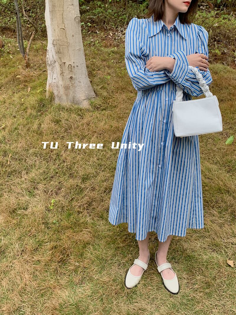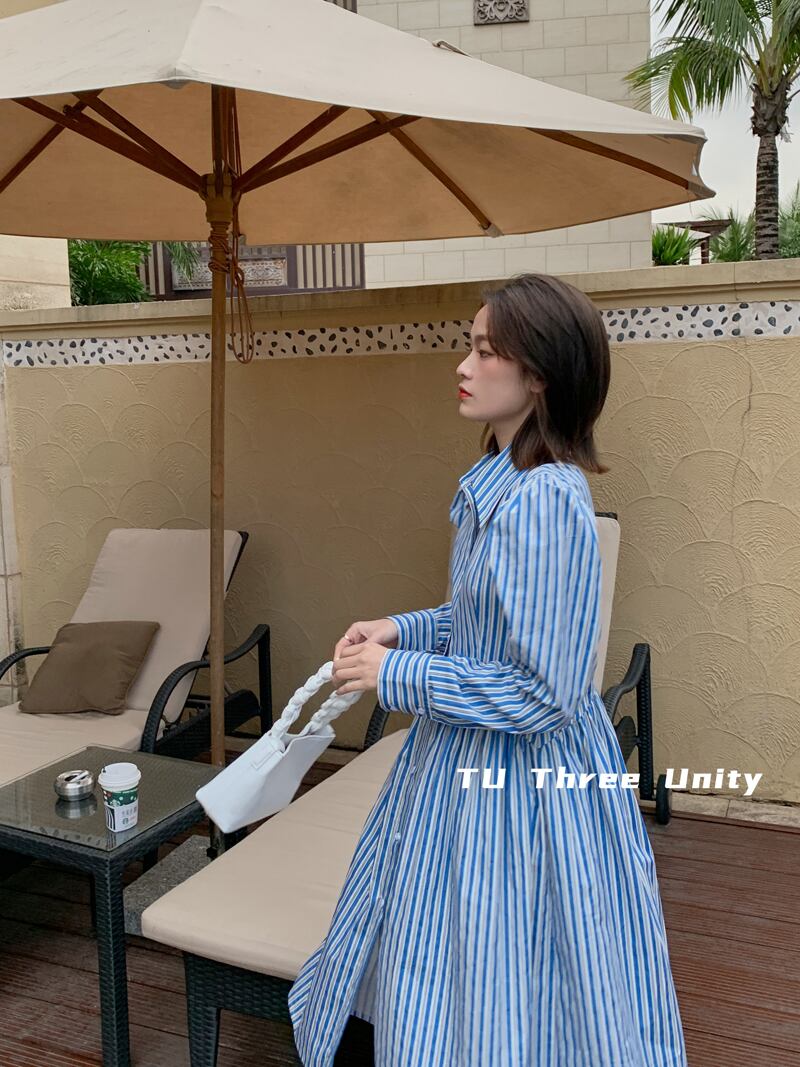 スタンダードカラーストライプシャツ スカート 薄手ブレストドレス ロングレディース レトロ ビッグFスモールZ韓国94030670941