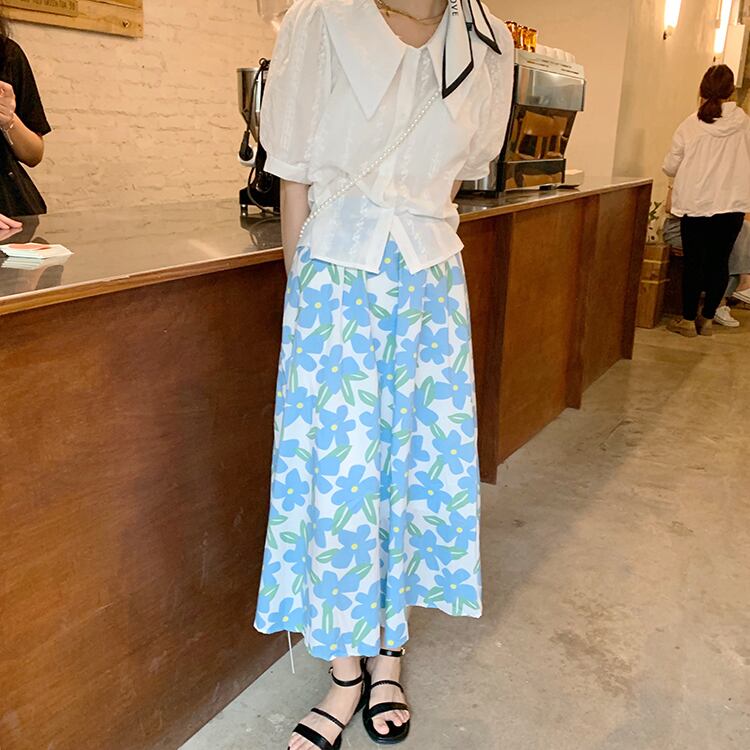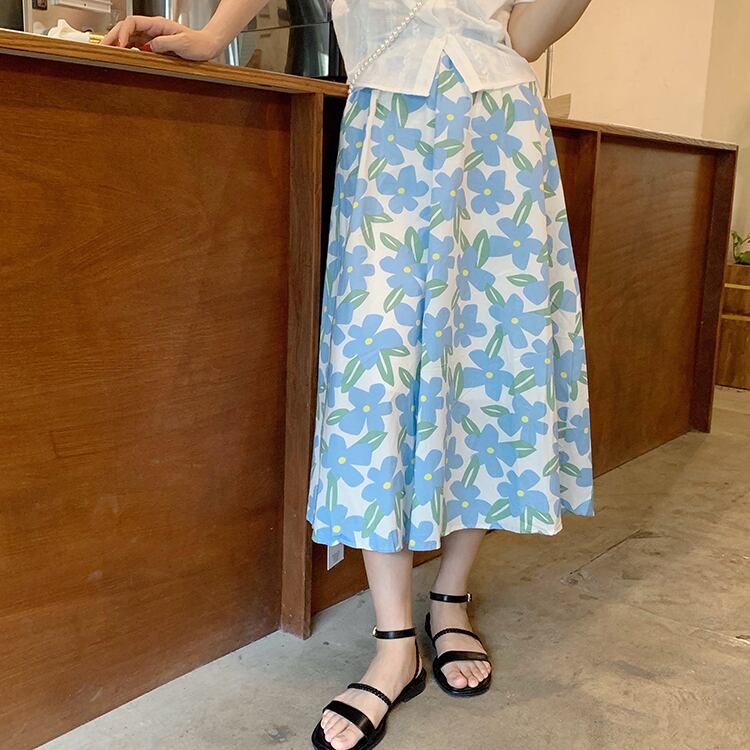 スカート サマーブループリント柄ストレッチハイウェスト薄手Aライン エラスティック 伸縮 夏物 ビッグFスモールZ韓国7614680877