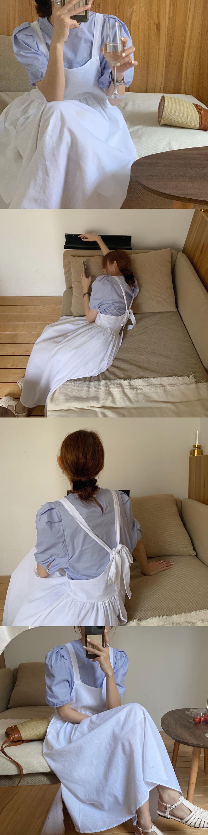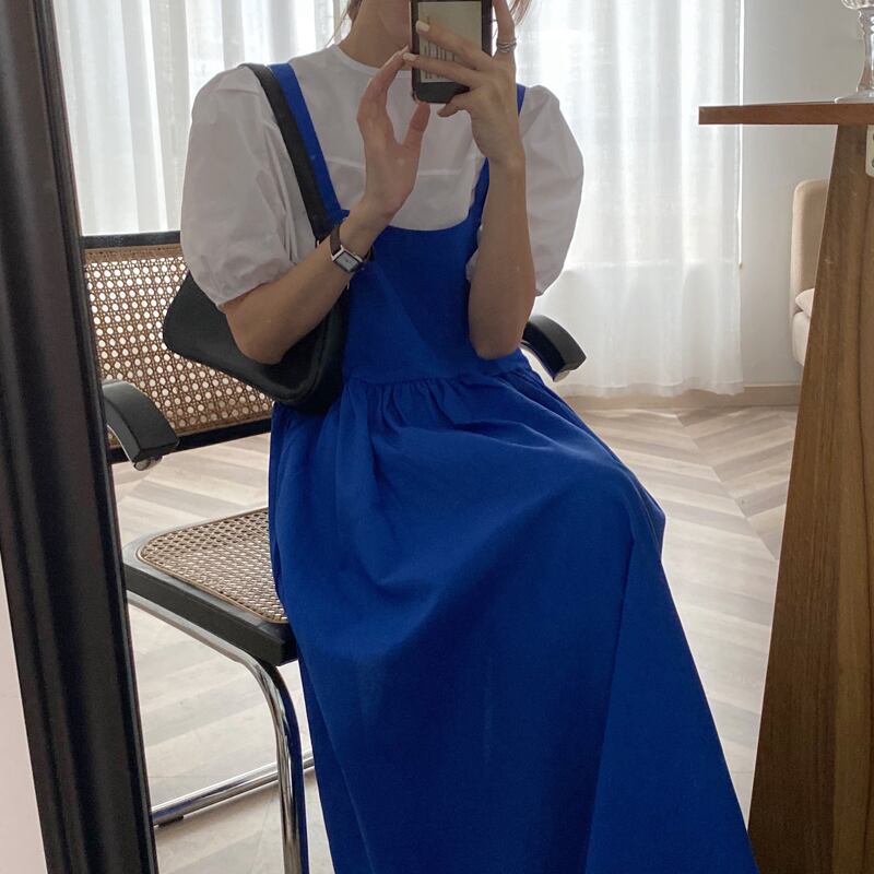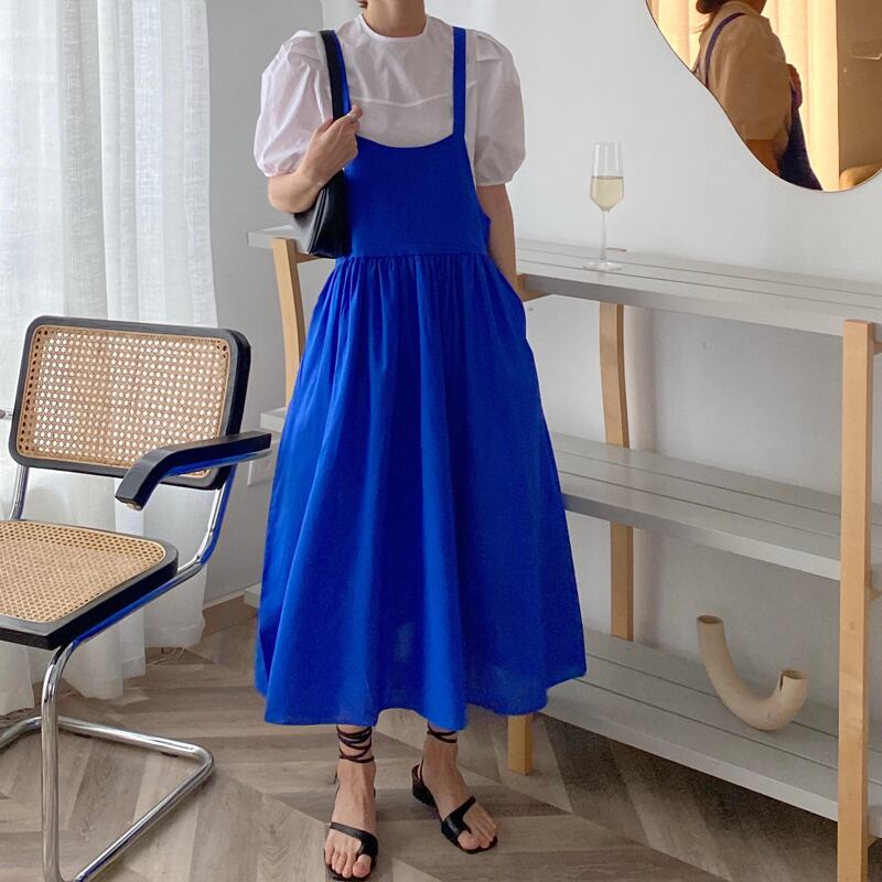 色:白いストラップドレス,ブルーストラップスカート,白のシャツ,青いシャツ