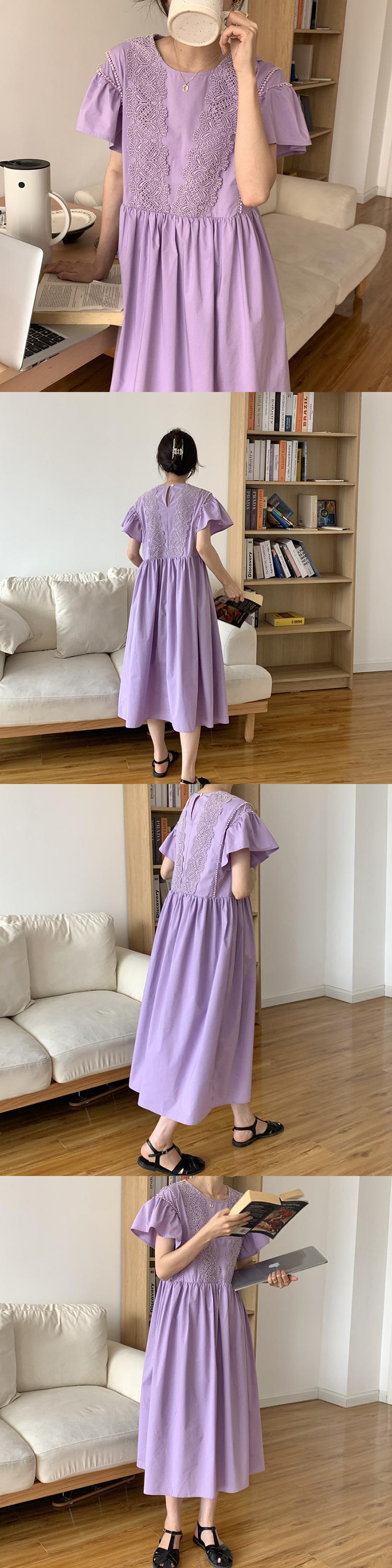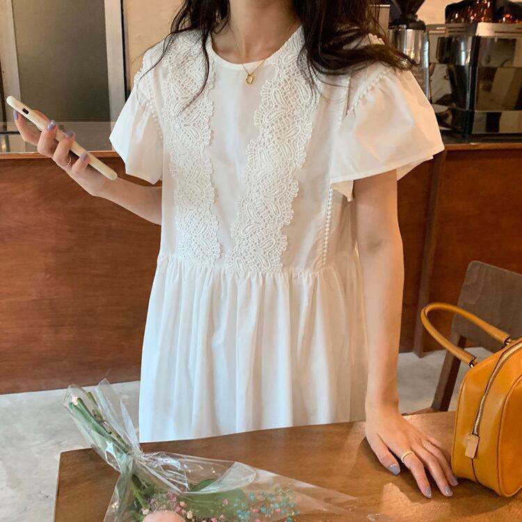 レースロングスカート サマールーズラウンドネック半袖スリーブハイウェストウェスト薄手ドレス ショート ハーフスリーブ 夏物 Oネック ステッチ ビッグFスモールZ韓国88948871586