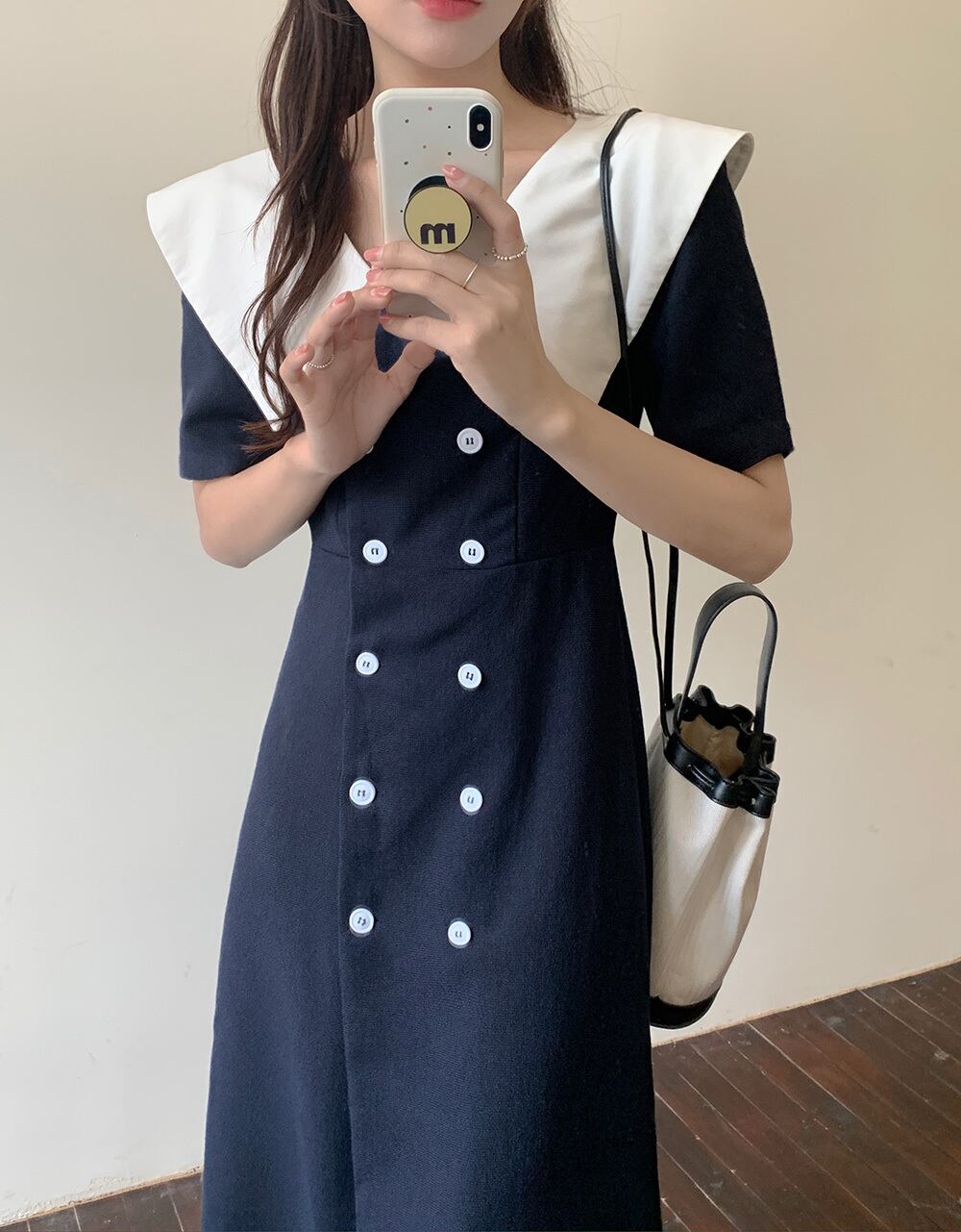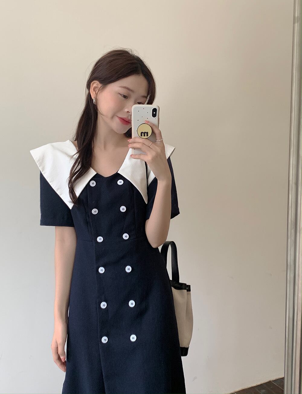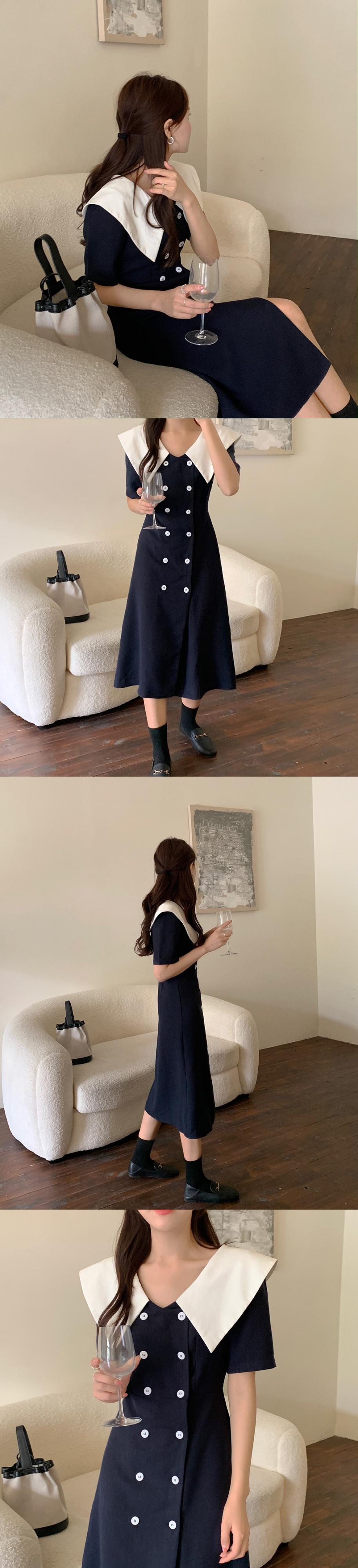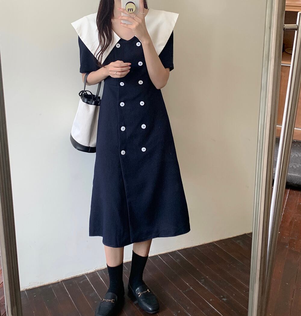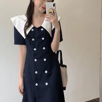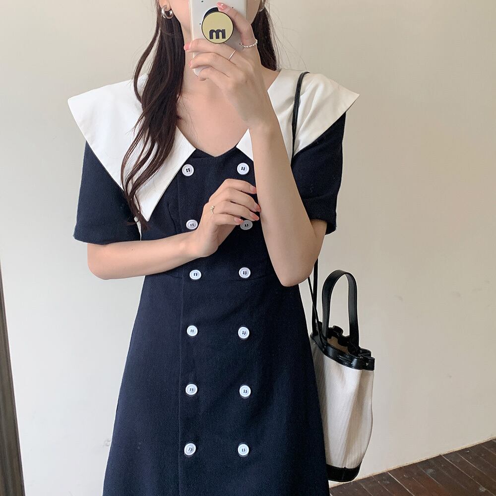 カラーネイビーダブルブレストスリムドレス サマースタイルスカート ブルー 夏物 ビッグFスモールZ韓国83531477125