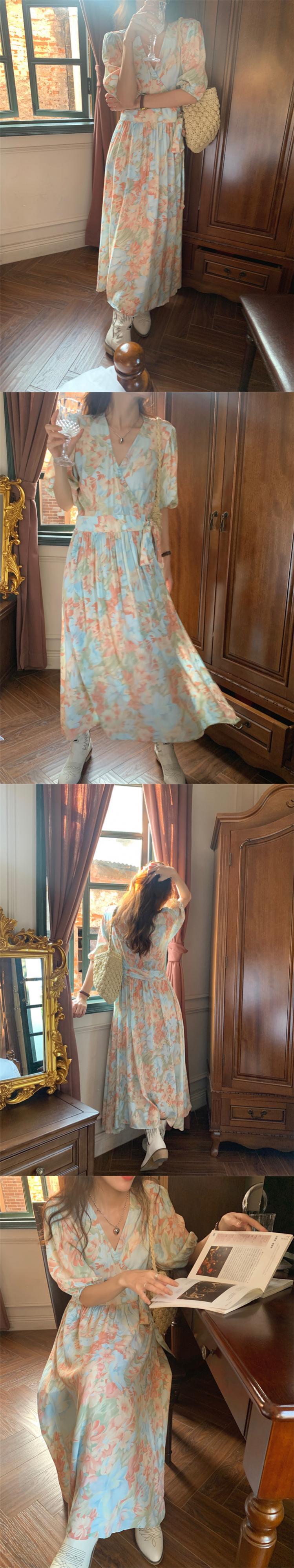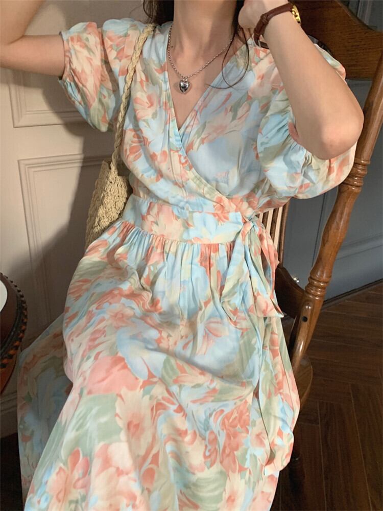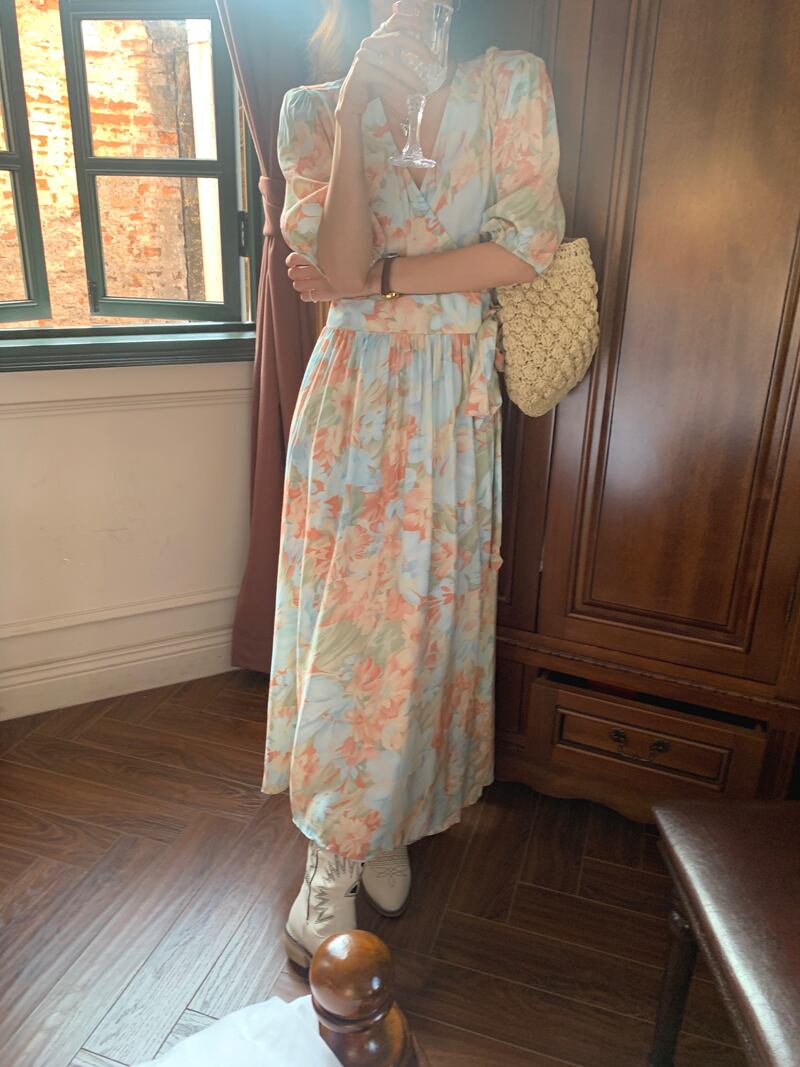 サイドプリーツハイウェストロングスカート サマールーズ薄手スリーブVネックドレス 夏物 ビッグFスモールZ韓国18013395238