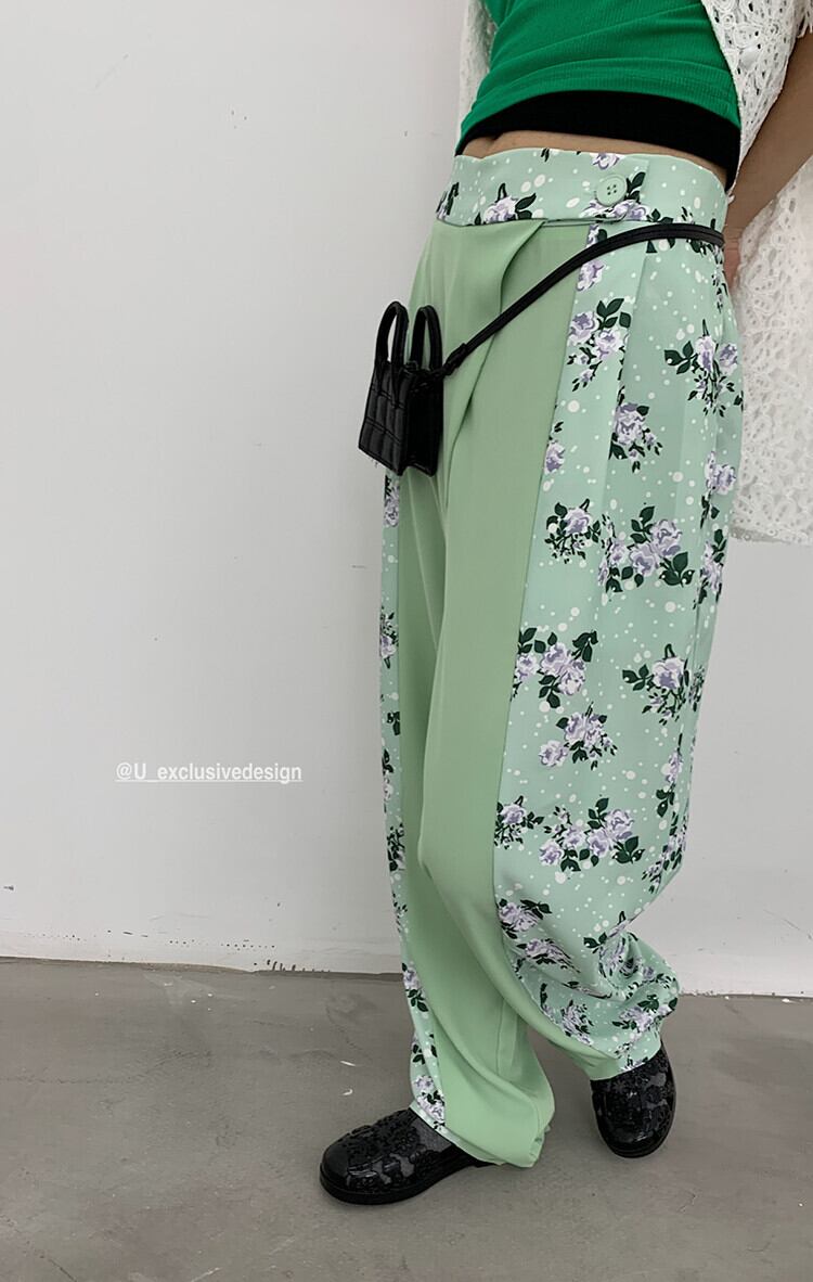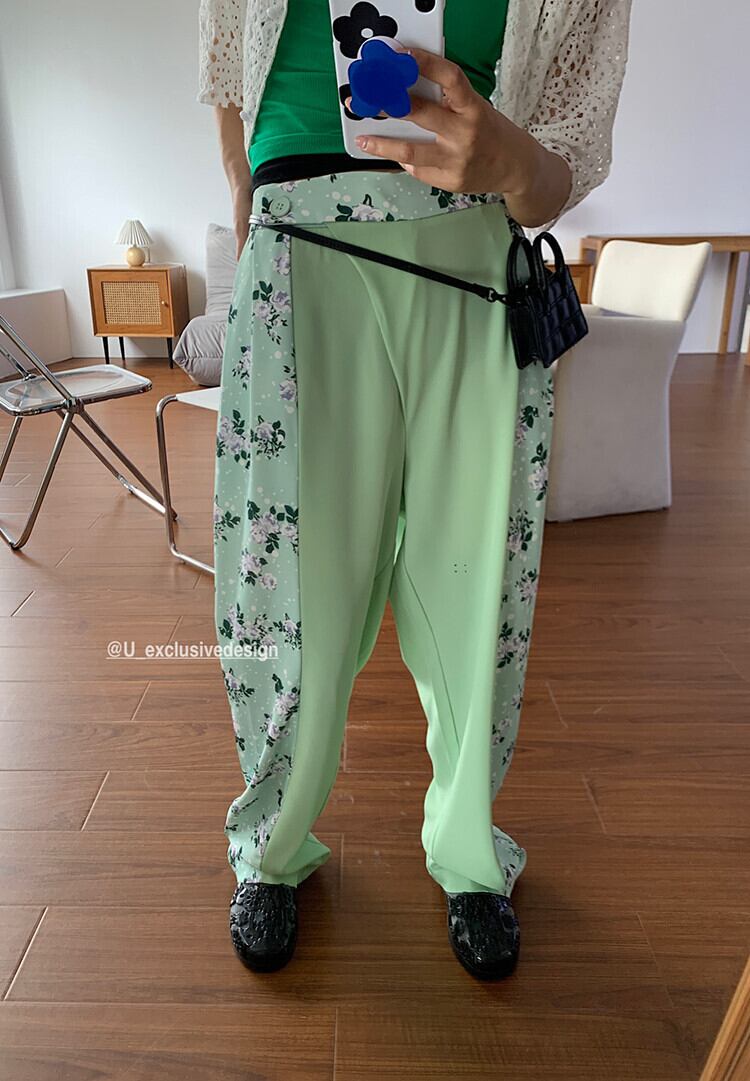 カラーカジュアルパンツ サマールーズ薄手グリーンフローラルロング 夏物 花柄 ビッグFスモールZ韓国71475781097