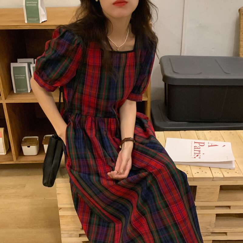 カラー格子柄スリーブドレス サマーウェストポケットロングスカート 夏物 スクウェア ビッグFスモールZ韓国64253906493