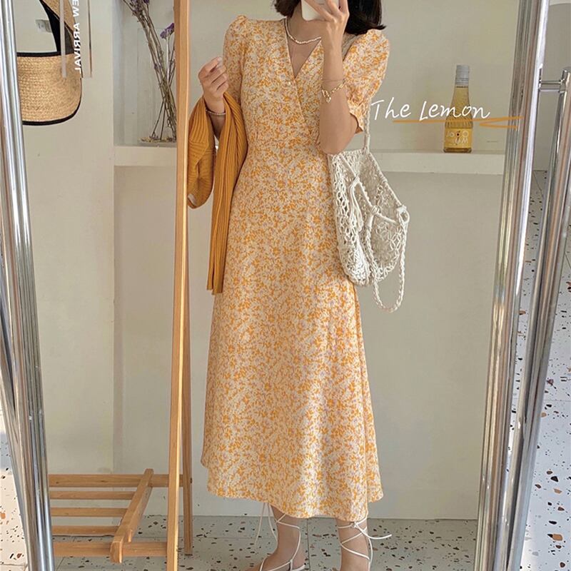 ウェストフローラルスカート サマースタイルスリムスリーブVネック レース 夏物 花柄 レースアップ ビッグFスモールZ韓国70061464529
