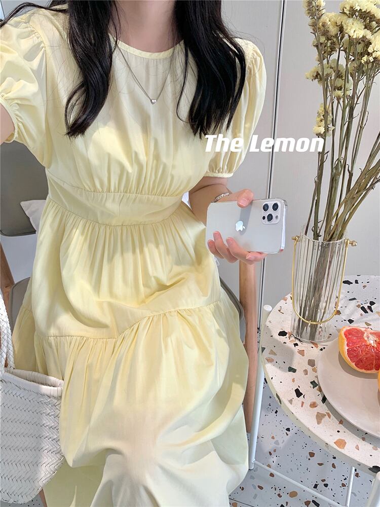 ハイウェストウェストドレス サマー薄手ラウンドネック半袖スリーブロング ショート ハーフスリーブ 夏物 Oネック ビッグFスモールZ韓国55319689047