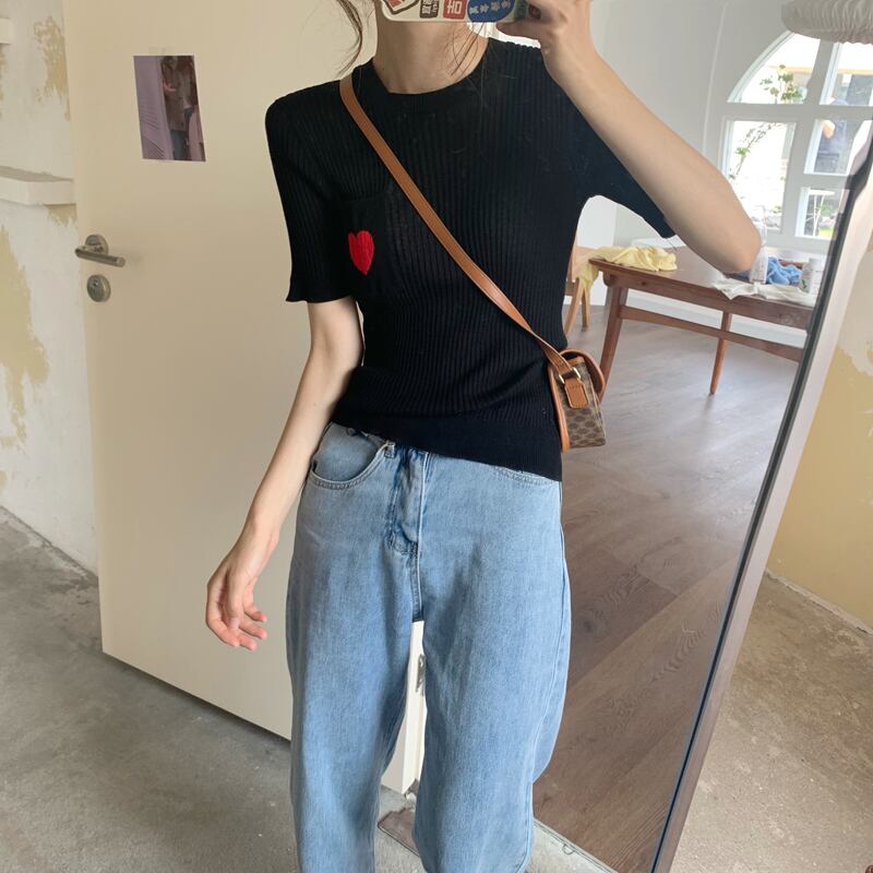 ニット スリムラウンドネック半袖スリーブトップス スプリングレディース ショート ハーフスリーブ 春物 Oネック ビッグFスモールZ韓国12362656682