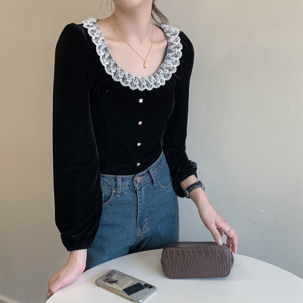 レースラウンドネックブラウス 薄手スリムベルベットシャツ スプリングレディース ロング 春物 Oネック ビッグFスモールZ韓国89833272920