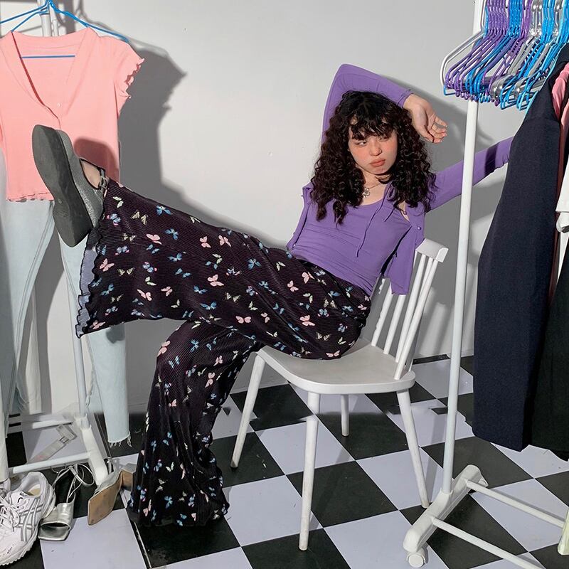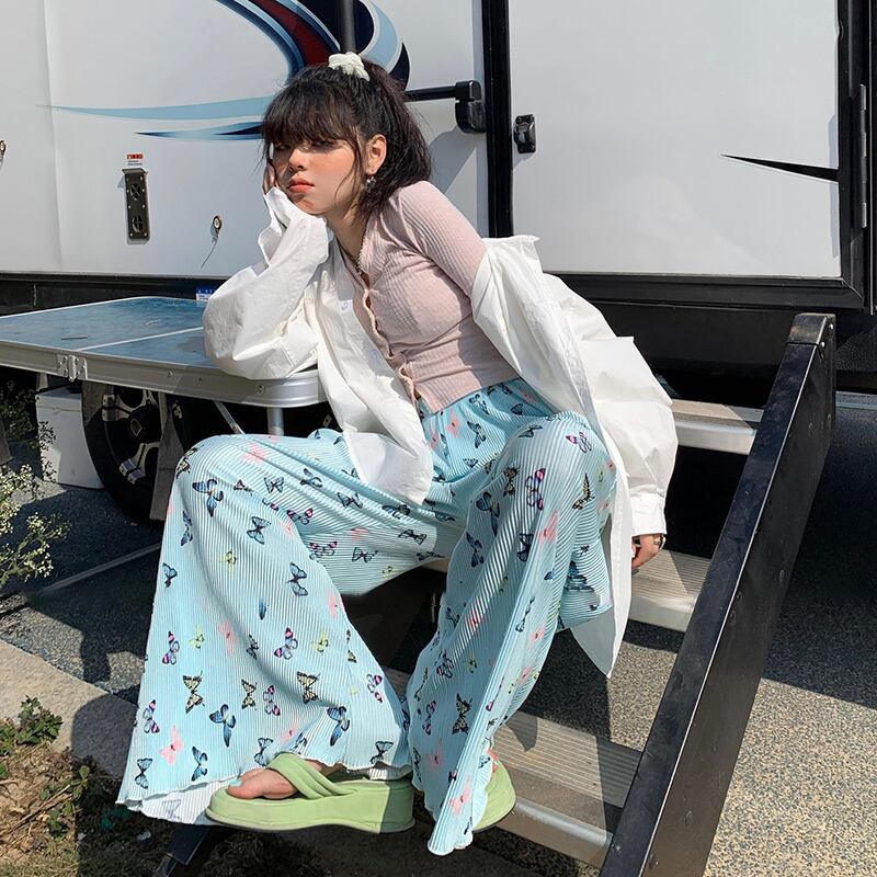 パンツ スプリングオータムハイウェストウェストストレッチ薄手ストライプButterflyデザイン ロング レッド エラスティック 伸縮 春物 秋物 ビッグFスモールZ韓国80502451408