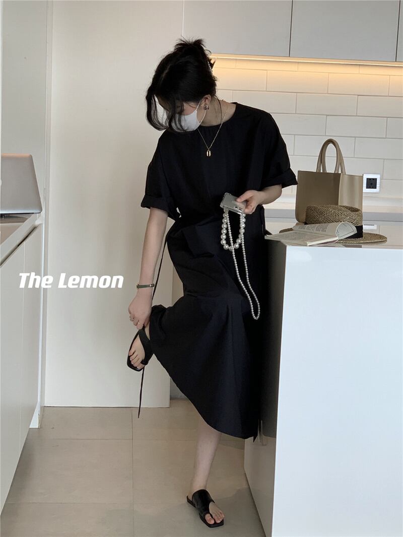 ソリッド カラーロングルーズベルト 半袖スリーブサマーレディース ショート ハーフスリーブ 夏物 ハーネス スカート ソリッドカラー ビッグFスモールZ韓国46172993573