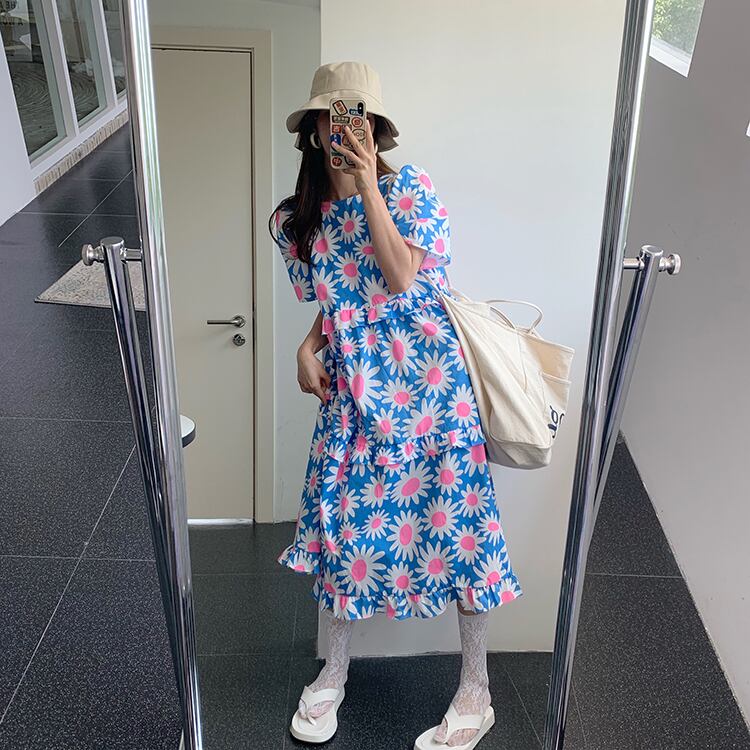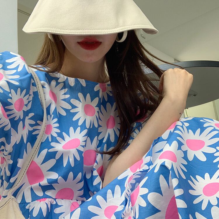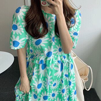Flowerデザイン ドレス サマールーズラウンドネックスリーブAラインスカート 夏物 Oネック フラワーデザイン ビッグFスモールZ韓国84037953798