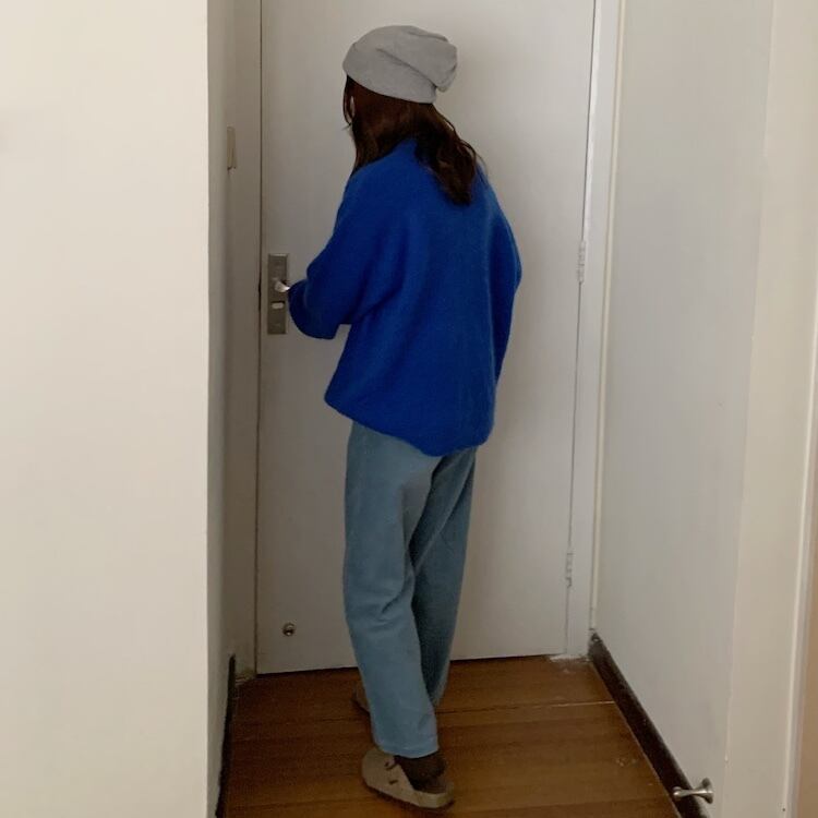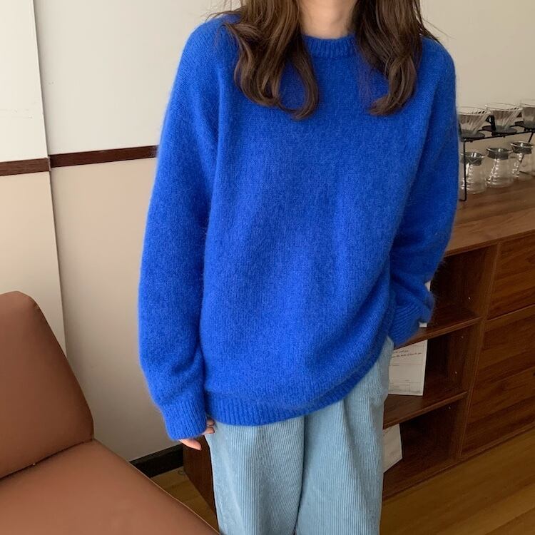 ホワイトラウンドネックソリッド カラーブルーセーター ルーズパンツ ハイウェストセット Oネック ソリッドカラー ビッグFスモールZ韓国62445174648