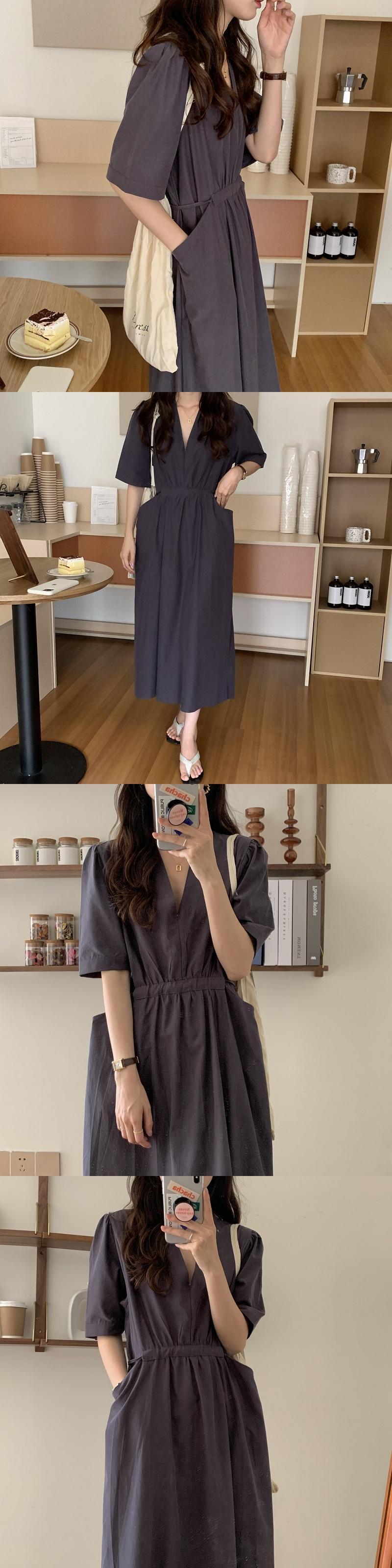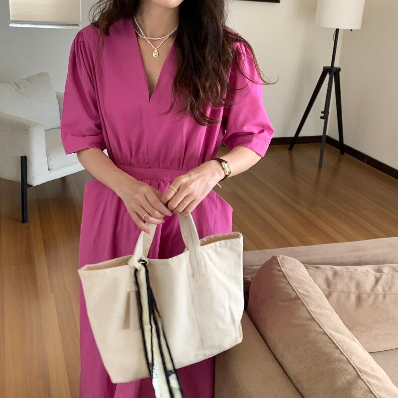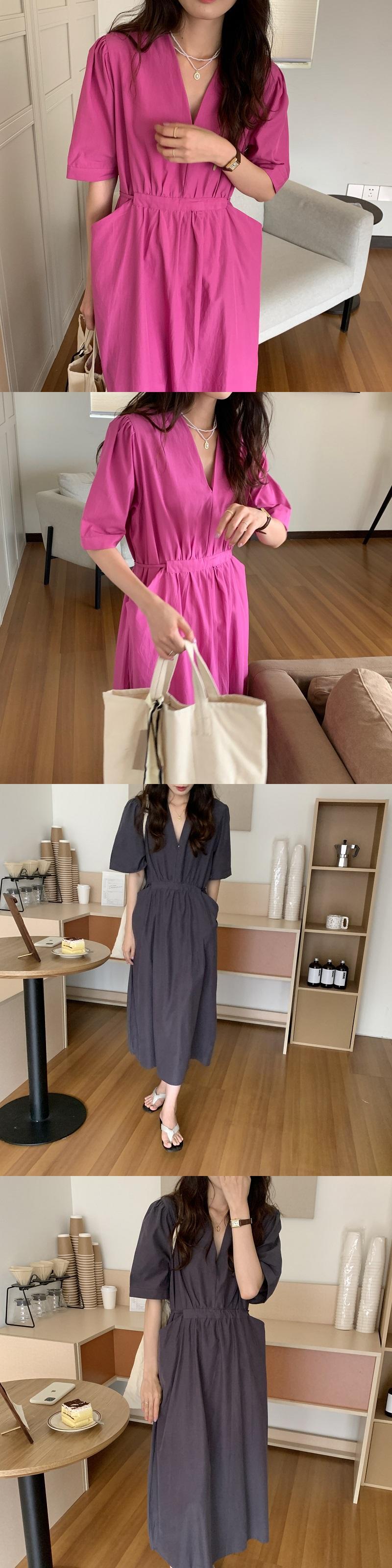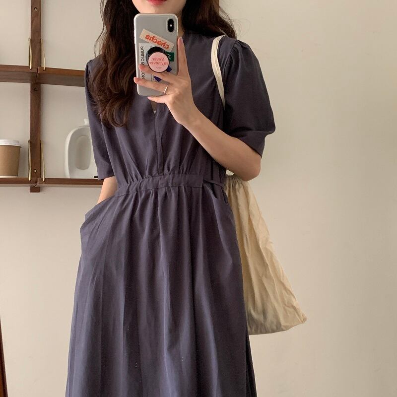 ポケットカジュアルドレス サマーハイウェストウェストVネックスリーブ薄手 夏物 ビッグFスモールZ韓国3700512789