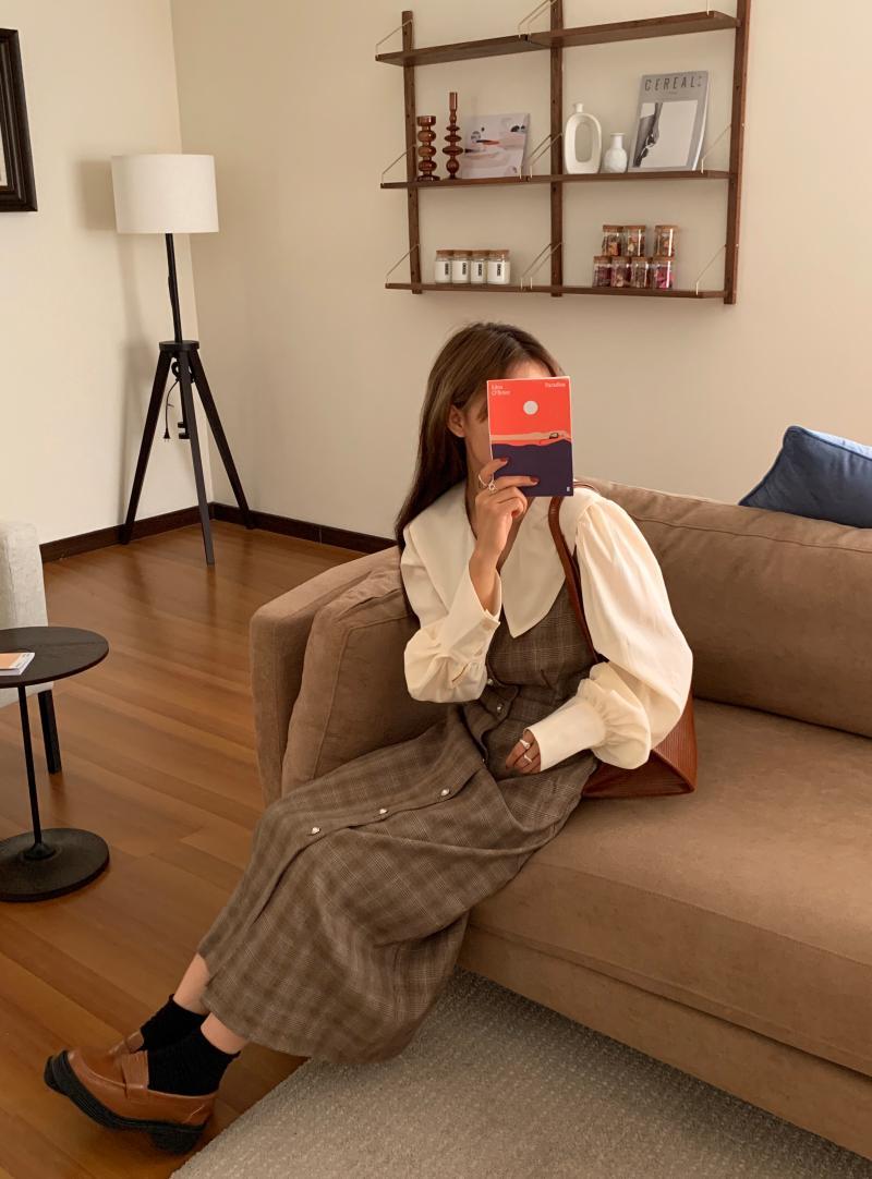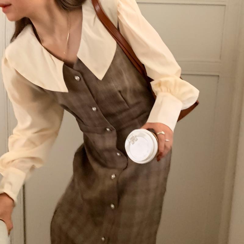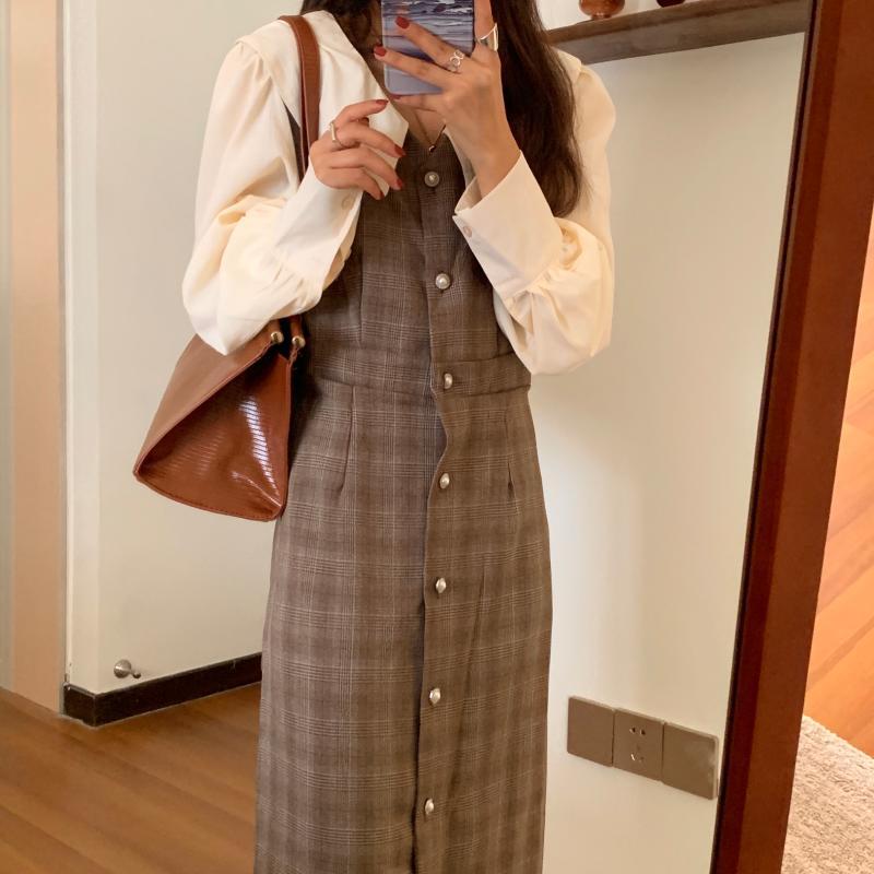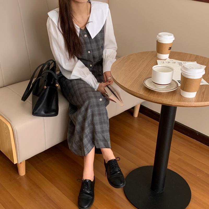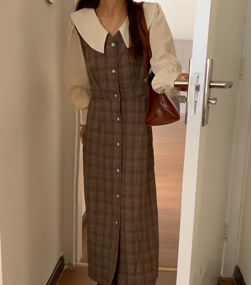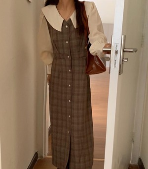 カラー格子柄スカート ドレス レディース ロング ステッチ ビッグFスモールZ韓国93972254442