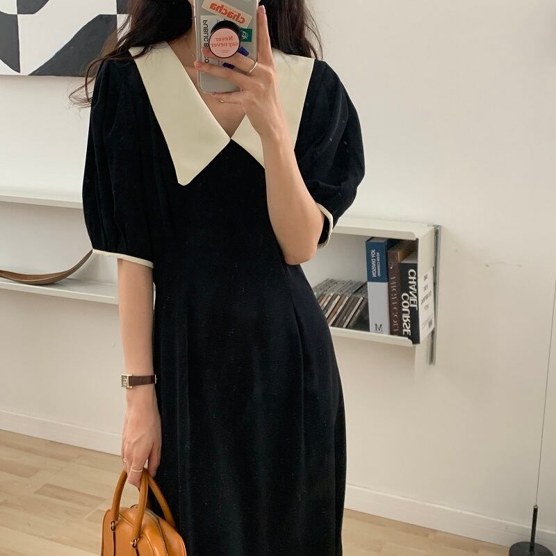 カラースリーブドレス サマースタイルハイウェストウェスト薄手Aラインロングスカート 夏物 ビッグFスモールZ韓国11988159684