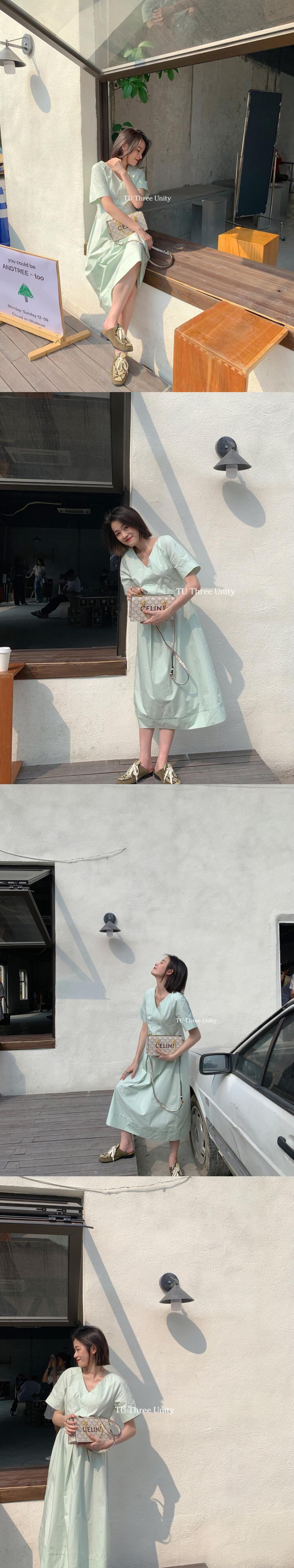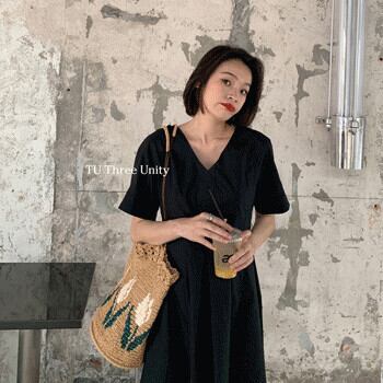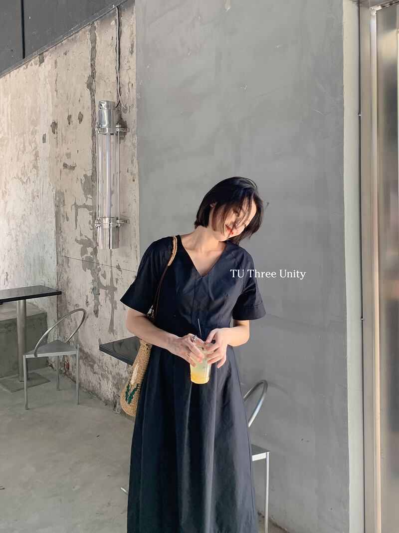 Vネックソリッド カラーロングスカート スタンダードドレス レディース レトロ ソリッドカラー ビッグFスモールZ韓国20904181177