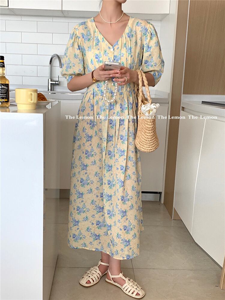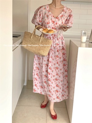 Vネックスリーブドレス サマーAラインスカート 夏物 ビッグFスモールZ韓国82346416977