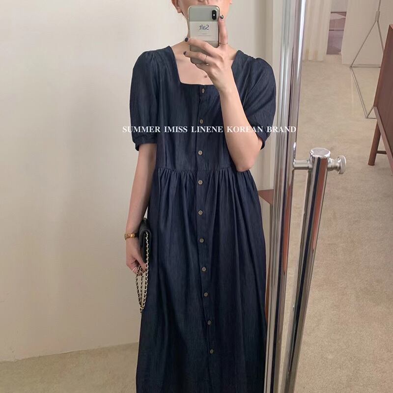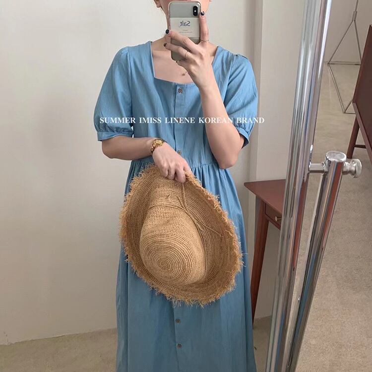 カラースリーブドレス サマープリーツAラインスカート 夏物 スクウェア ビッグFスモールZ韓国9628302349
