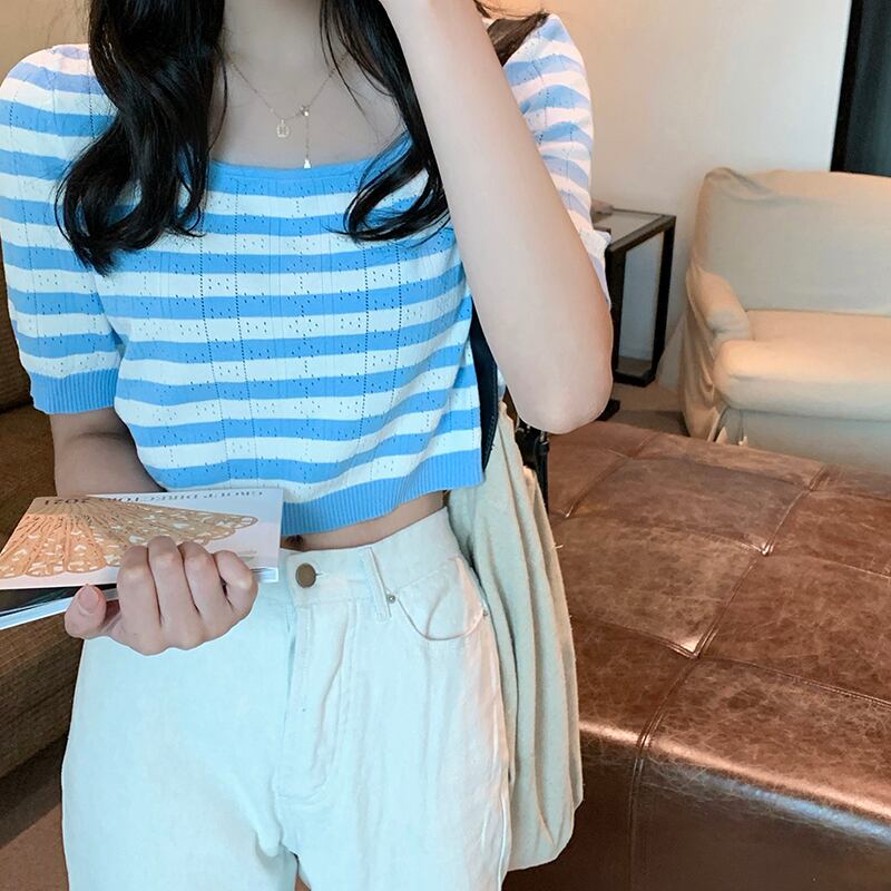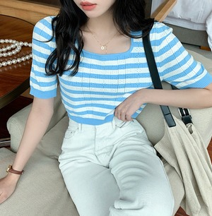 ストライプカラーラウンドネックショートTシャツ シャツ サマー薄手 夏物 Oネック ビッグFスモールZ韓国36569870250