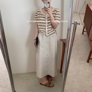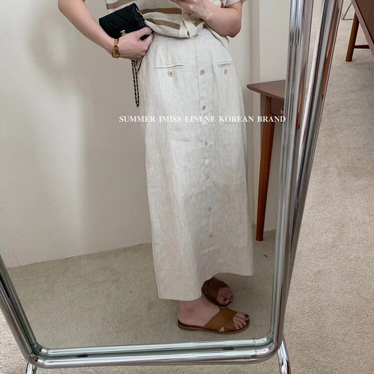 ソリッド カラーボタンスカート サマー薄手ポケットハイウェストウェストロング 夏物 ソリッドカラー ビッグFスモールZ韓国6791624313