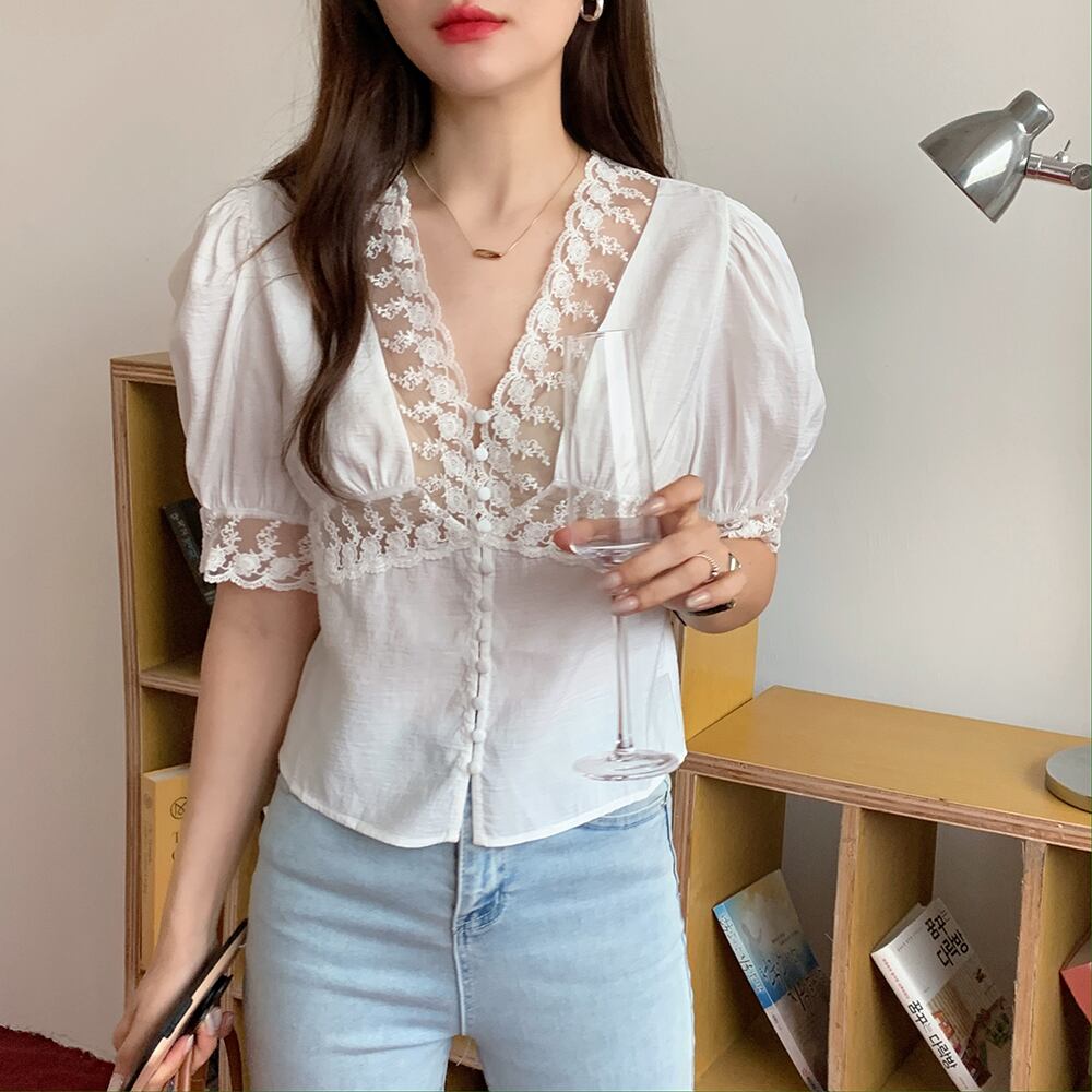 Flowerデザイン レースショートシャツ サマースタイルスリーブプリーツVネックトップス 夏物 フラワーデザイン ステッチ ビッグFスモールZ韓国8398333252