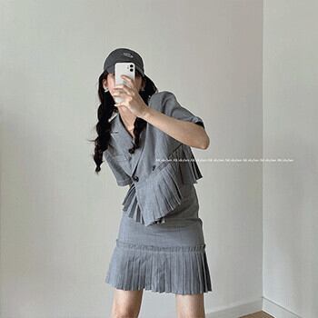 プリーツボタンカジュアルジャケット サマーソリッド カラーショートスカート 夏物 ソリッドカラー ビッグFスモールZ韓国43423237555