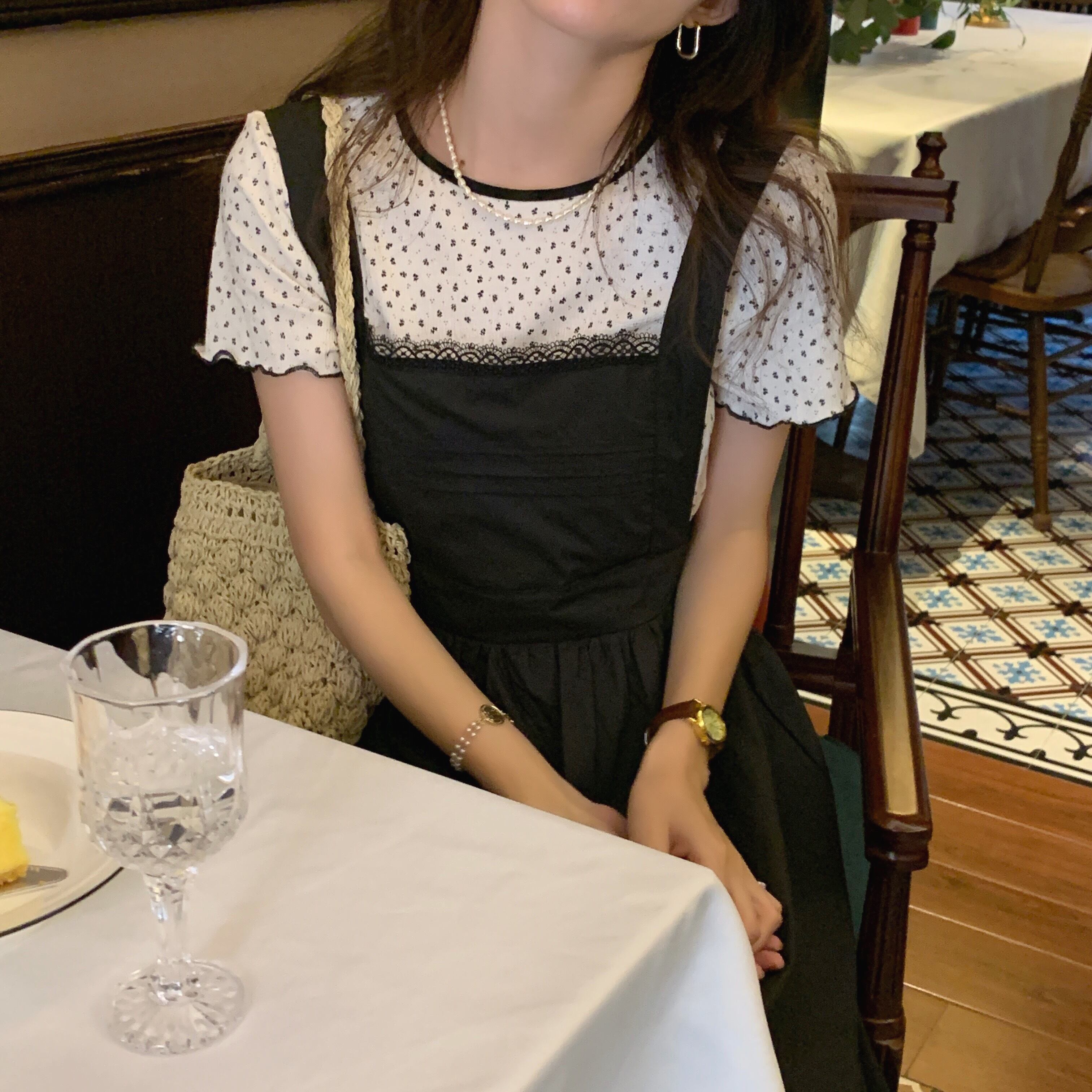 色:赤い花のTシャツ,ブラックフラワーTシャツ,白いストラップドレス,ブラックストラップドレス