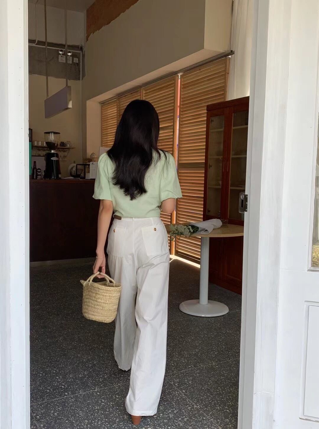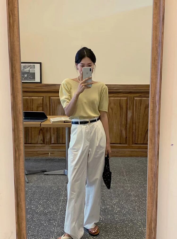 ワイドレッグパンツ サマースタイル薄手ルーズホワイトウェストプリーツ コットン 夏物 ワイドパンツ ビッグFスモールZ韓国99630192046