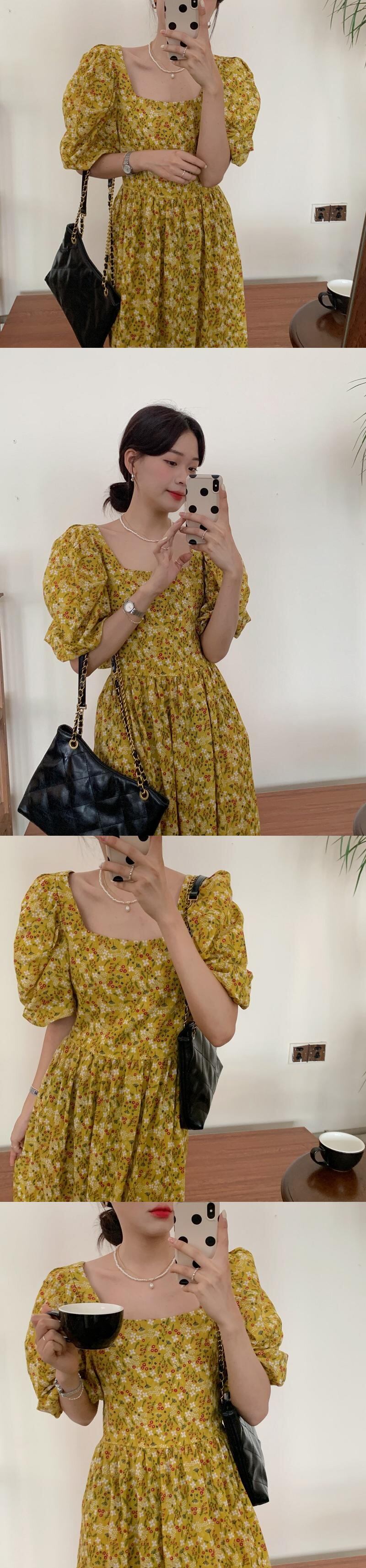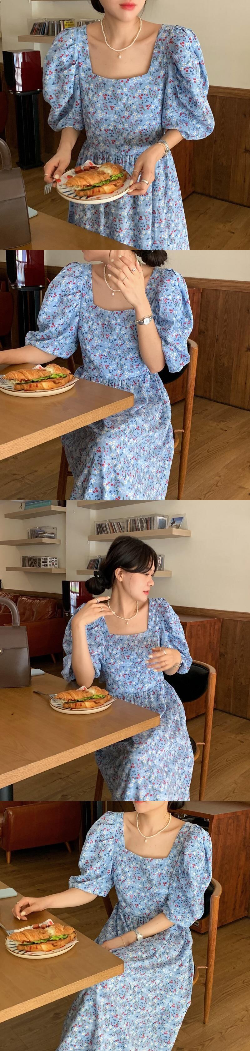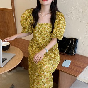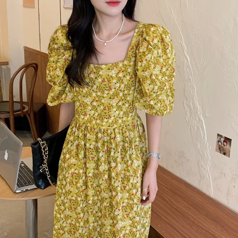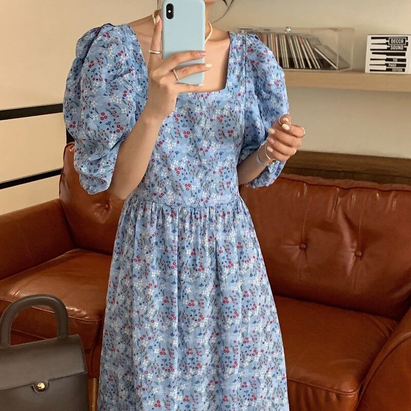 フローラルスリーブドレス サマースタイルウェスト薄手Aラインロング 夏物 花柄 スクウェア ビッグFスモールZ韓国33362655918