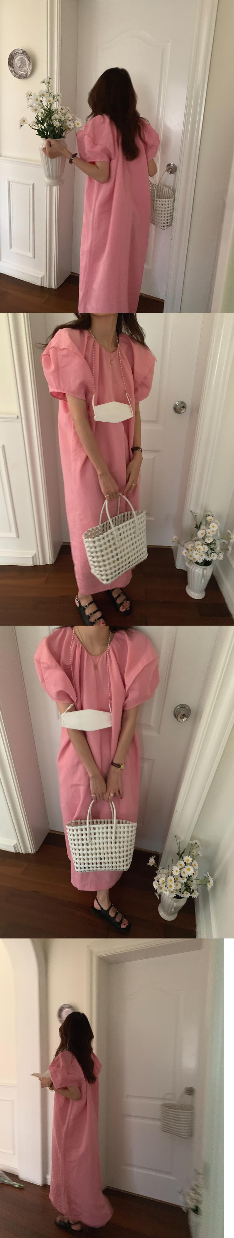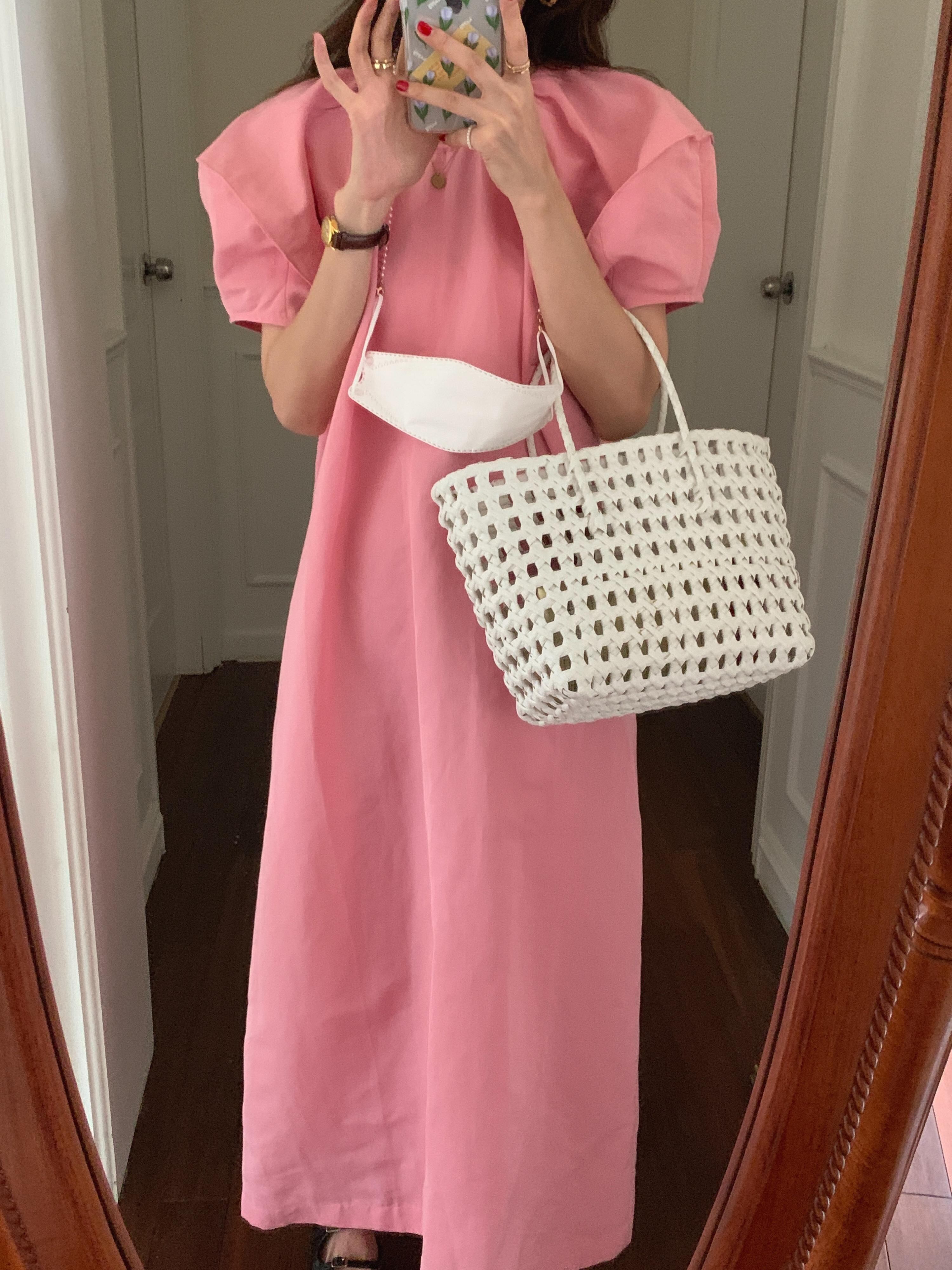 ラウンドネックドレス サマースリーブルーズロングスカート ピンク 夏物 Oネック ビッグFスモールZ韓国60378483451
