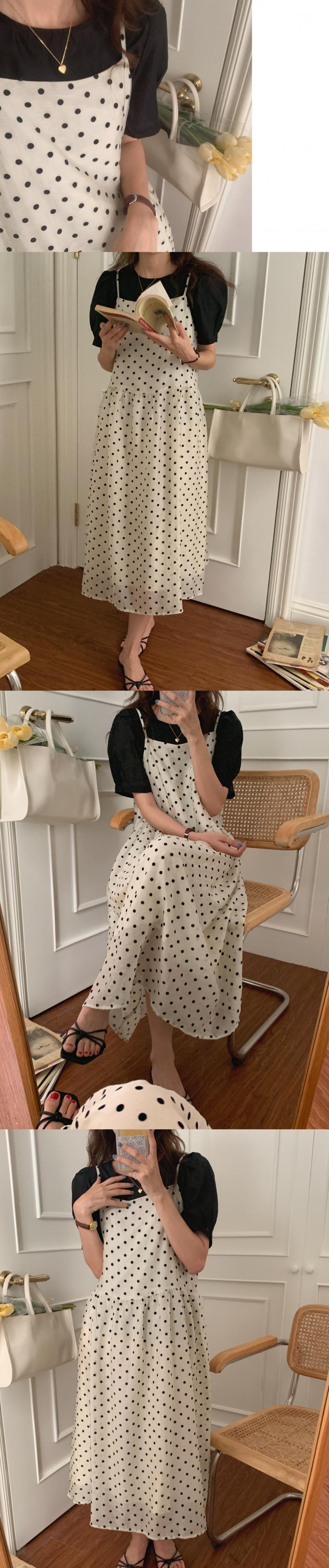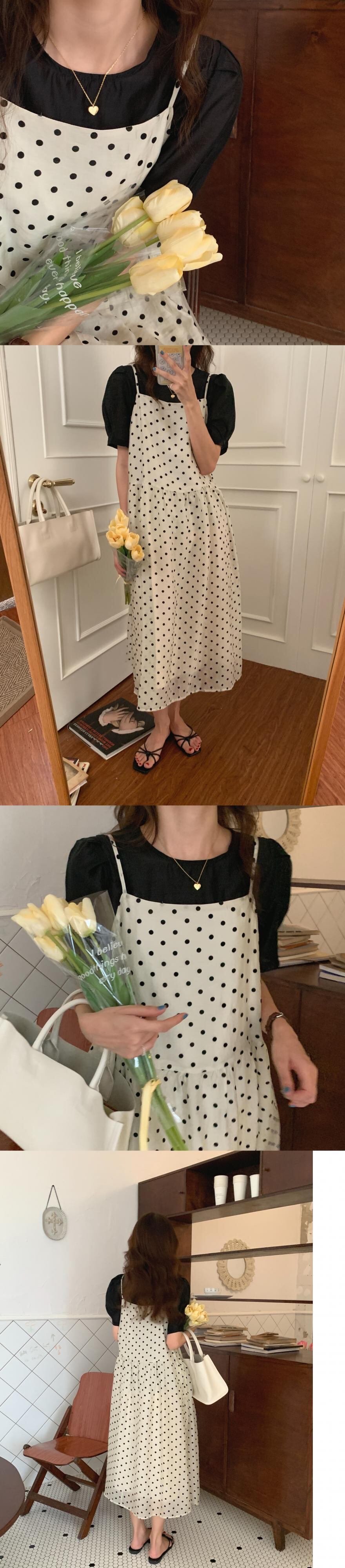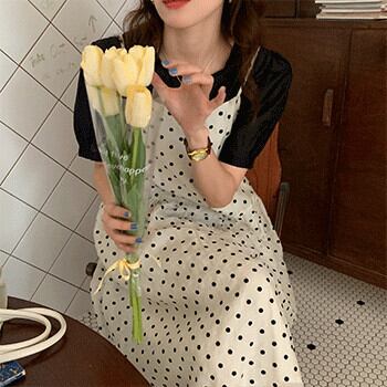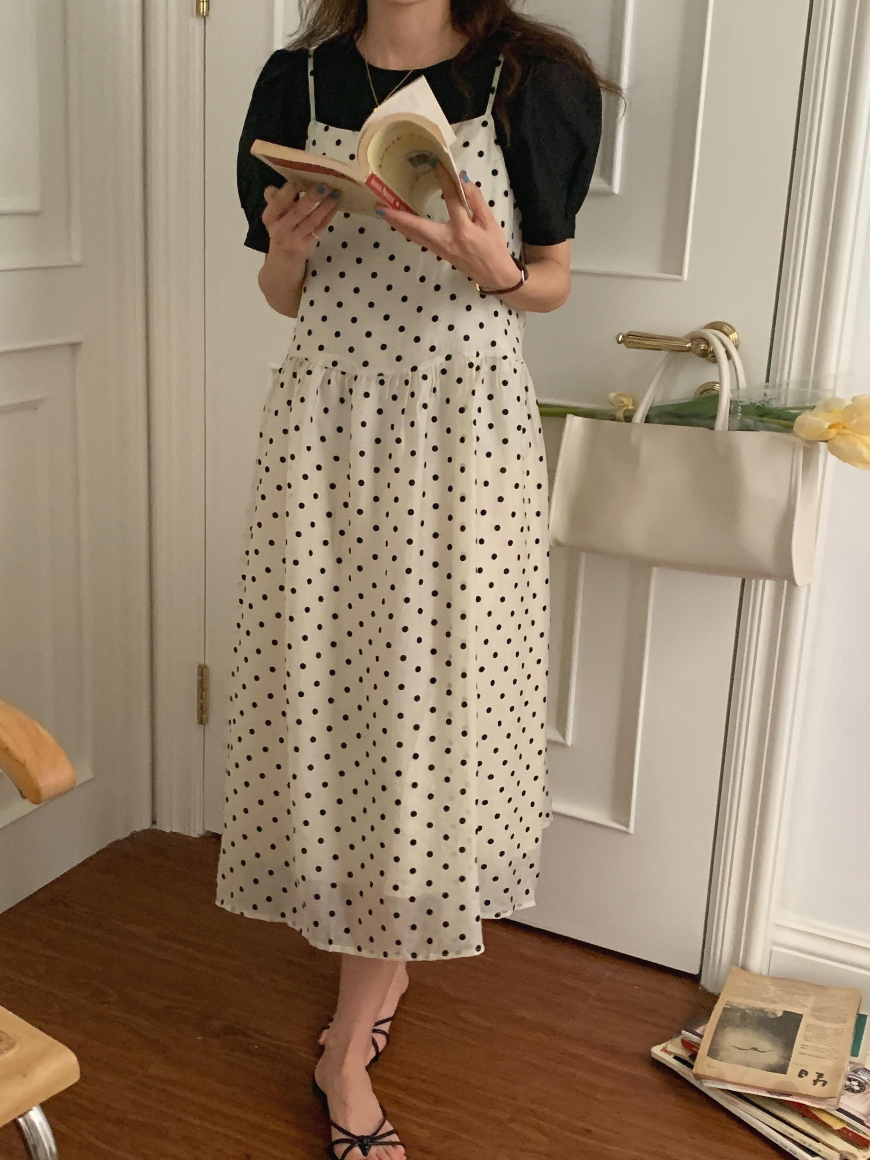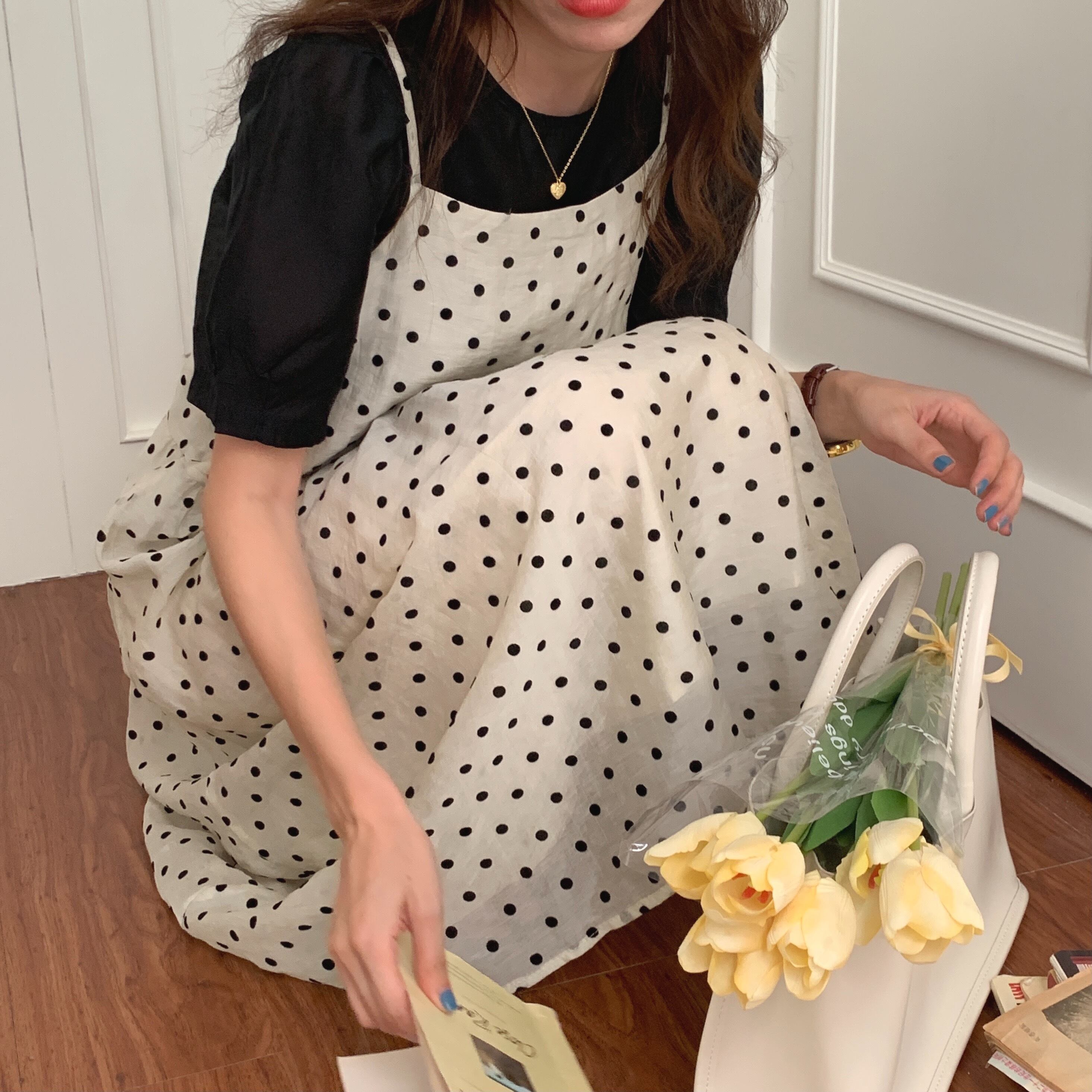 色:黒いシャツ,水玉スカート