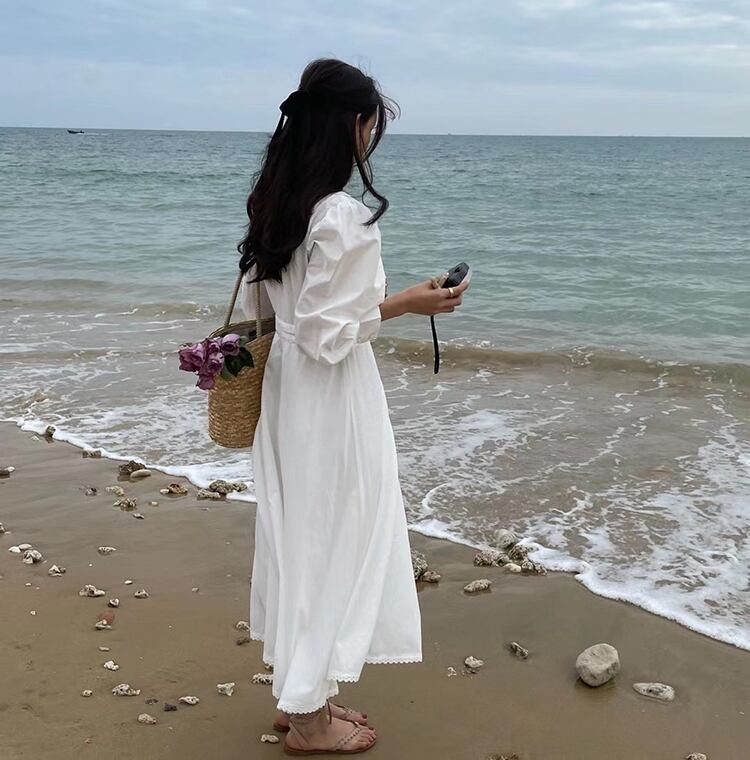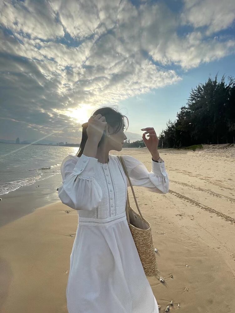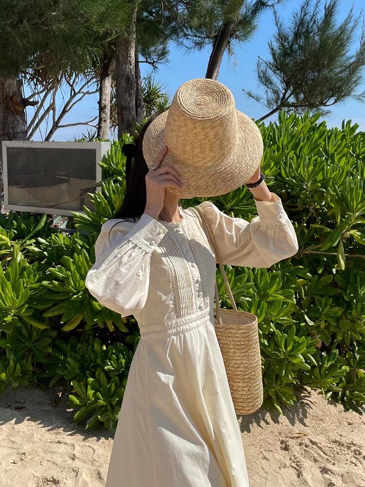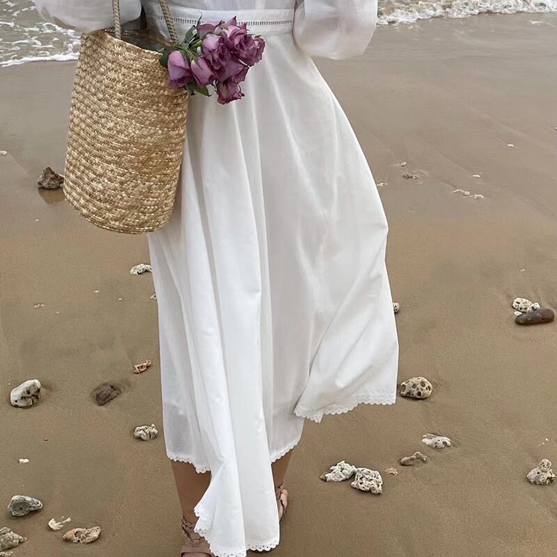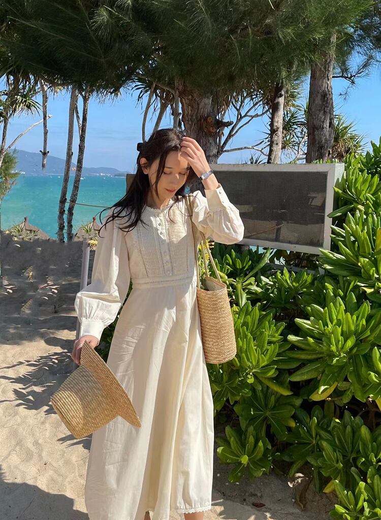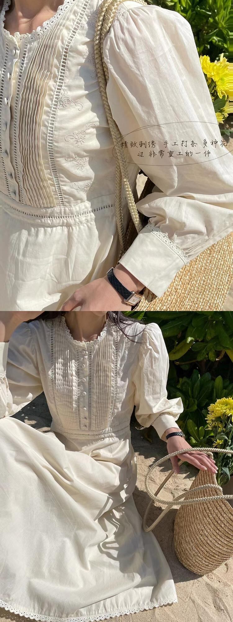 ドレス スプリングオータムレースラウンドネックハイウェストプリーツベージュミディスカート ロング 春物 秋物 Oネック ビッグFスモールZ韓国31144659608