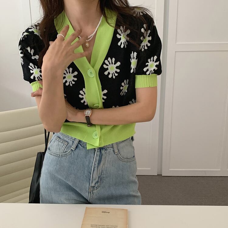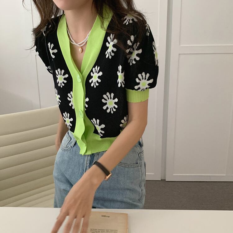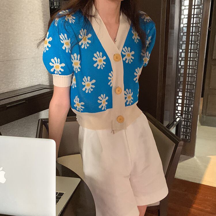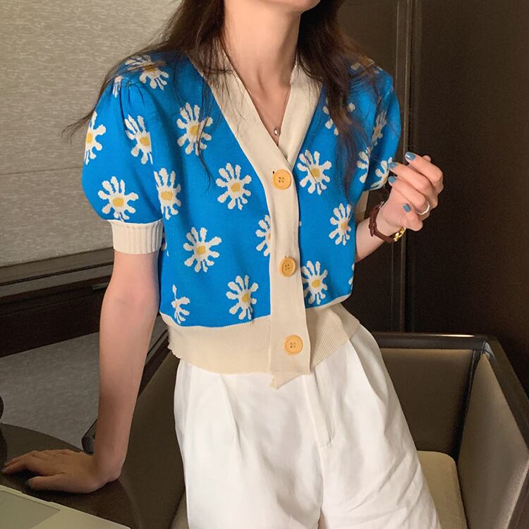 カラーFlowerデザイン ショートセーター サマースタイル薄手スリムボタン半袖スリーブトップス ハーフスリーブ 夏物 フラワーデザイン ビッグFスモールZ韓国67941520762