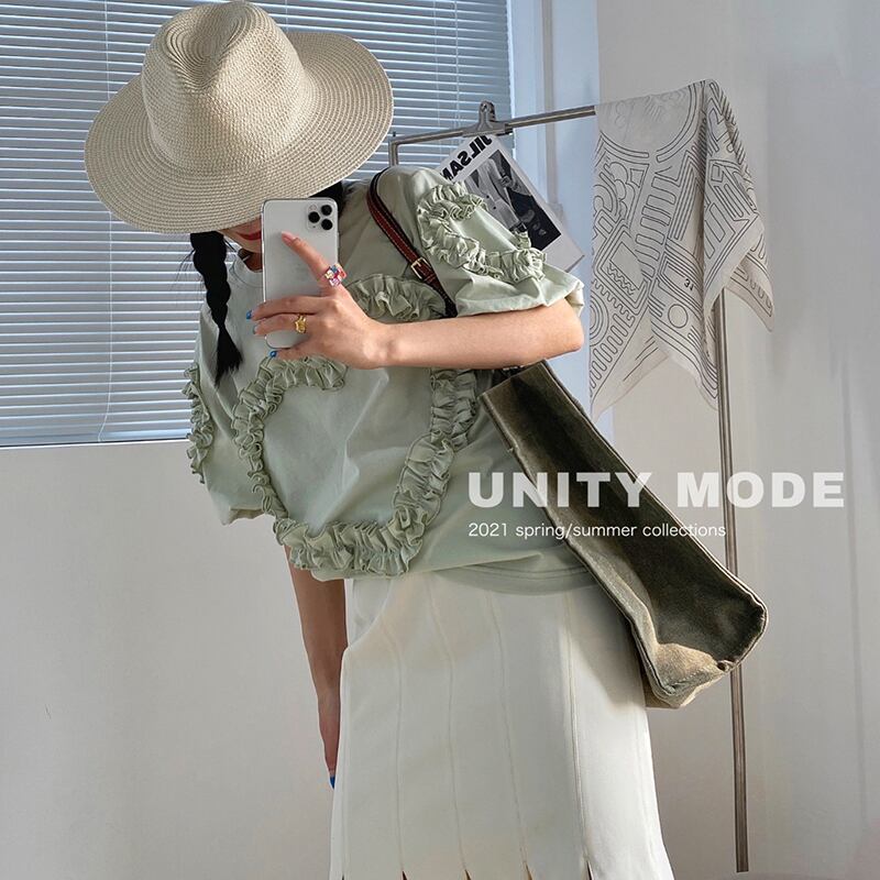 プリーツスリーブTシャツ サマールーズ薄手ラウンドネックトップス コットン 夏物 Oネック ビッグFスモールZ韓国86179262673