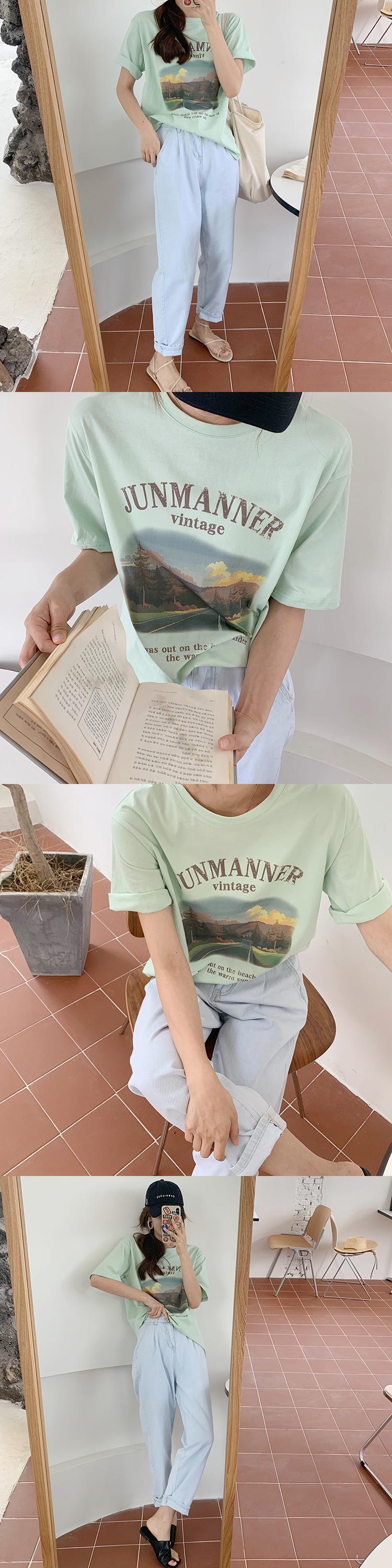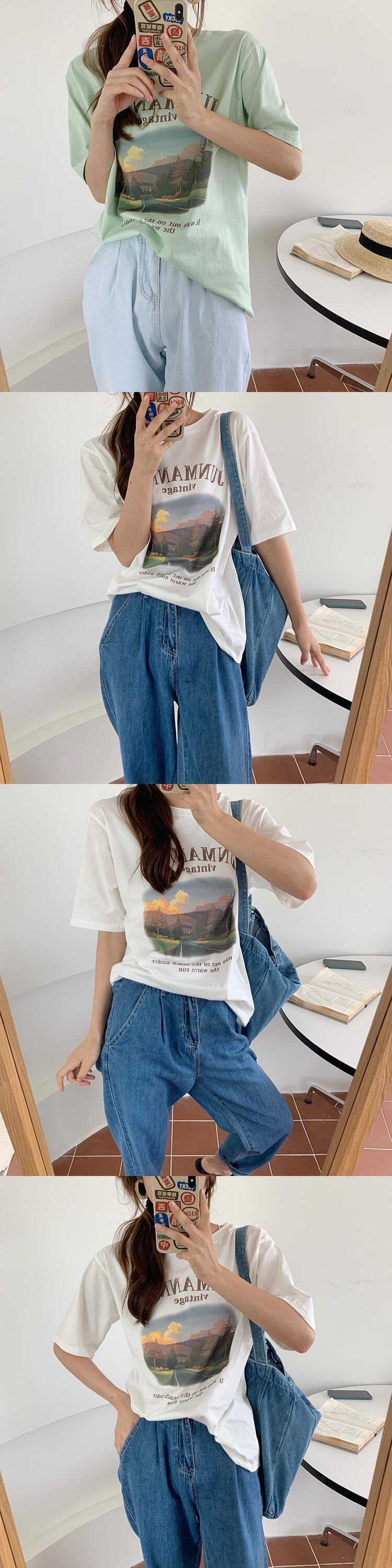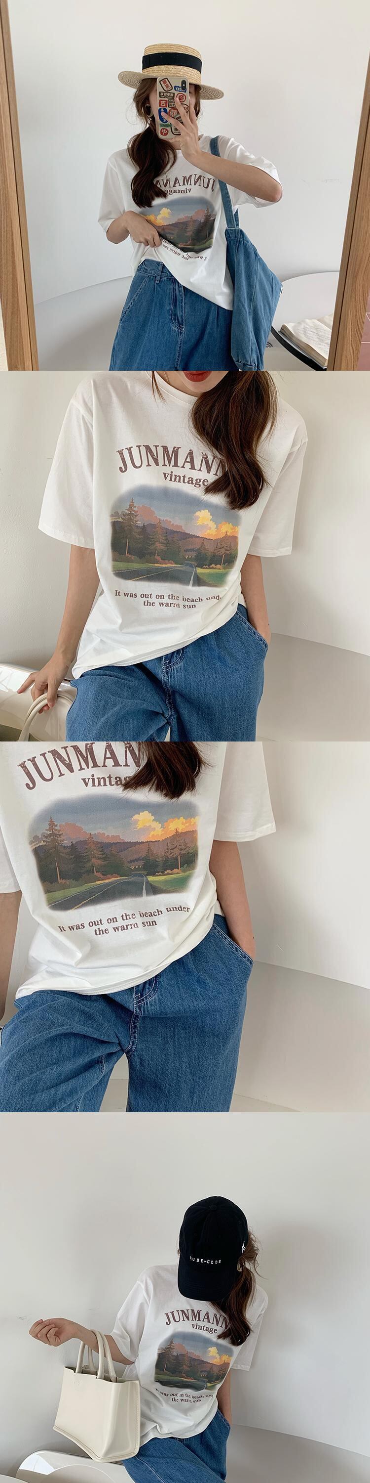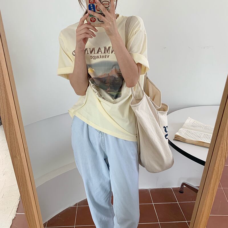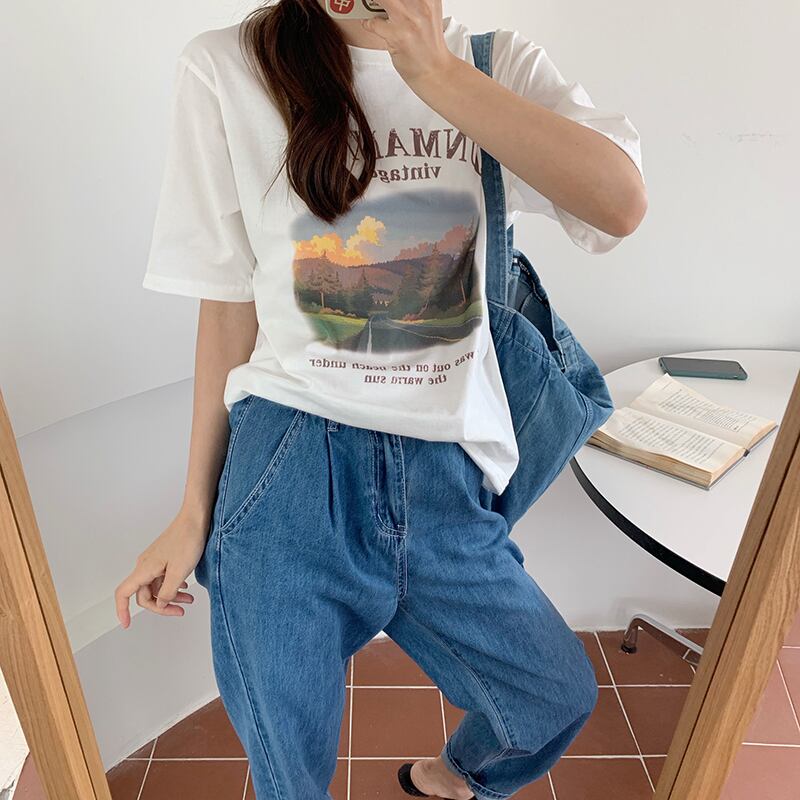 プリント柄ラウンドネックTシャツ シャツ サマーホワイト薄手 夏物 Oネック ビッグFスモールZ韓国38509311337