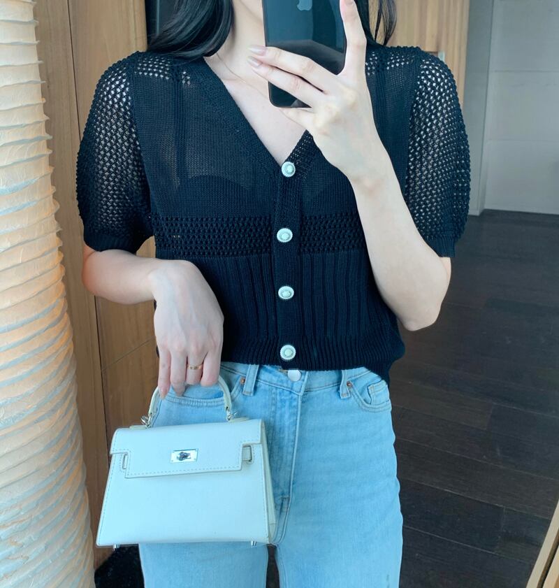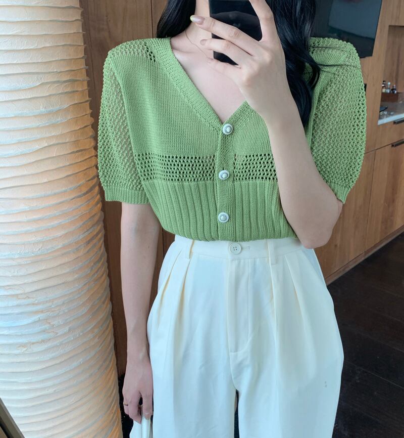 ストライプ薄手ボタンニット Vネック半袖スリーブトップス サマー ショート ハーフスリーブ 夏物 ビッグFスモールZ韓国22109678280
