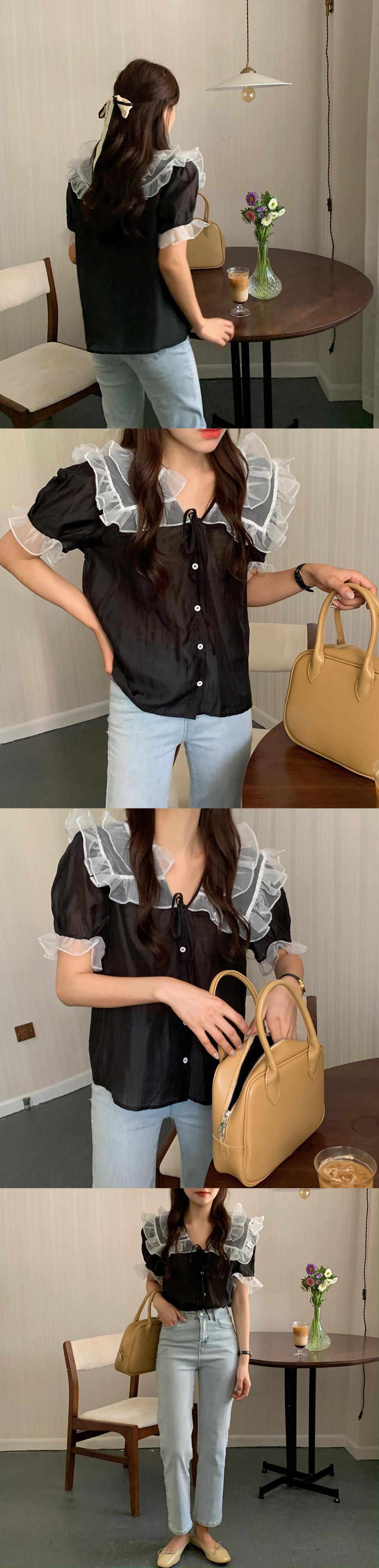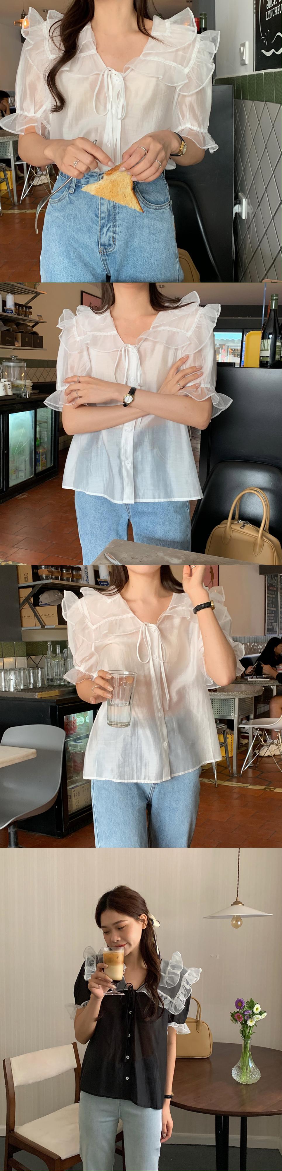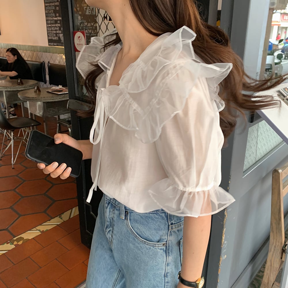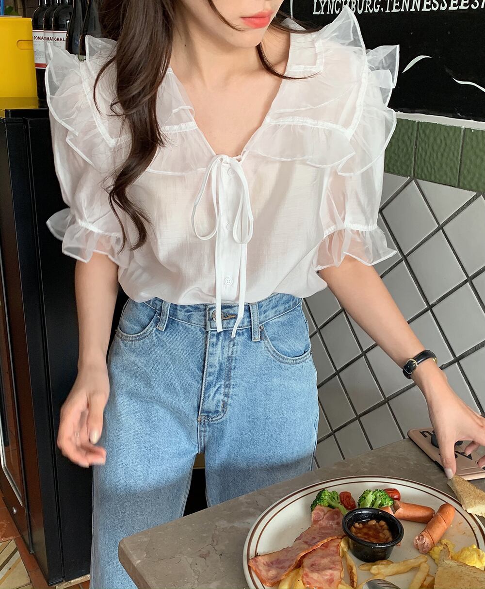 薄手レースカラーシャツ サマーVネック半袖スリーブトップス ショート ハーフスリーブ 夏物 レースアップ ビッグFスモールZ韓国85416490615