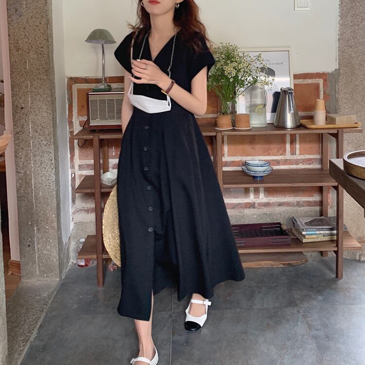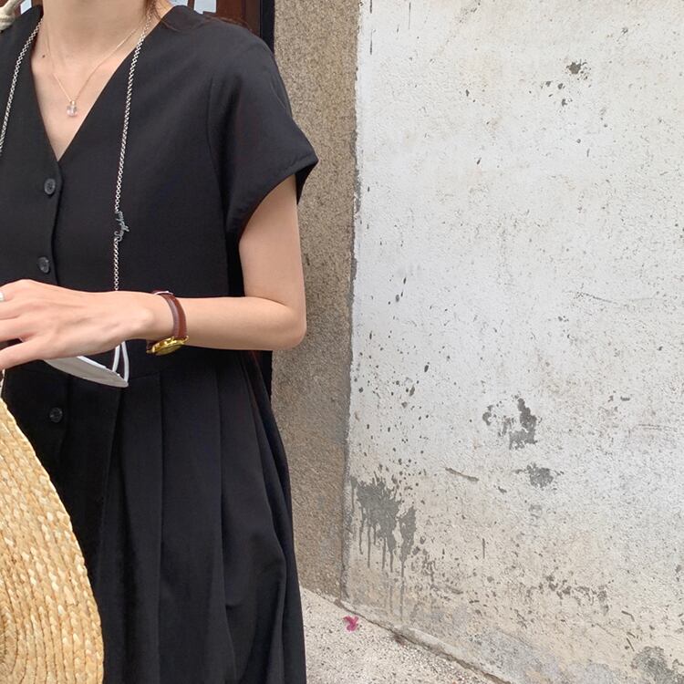 ホルタードレス レディースサマープリーツウェストポケットVネック半袖スリーブスカート ショート ハーフスリーブ 夏物 ビッグFスモールZ韓国39212095822