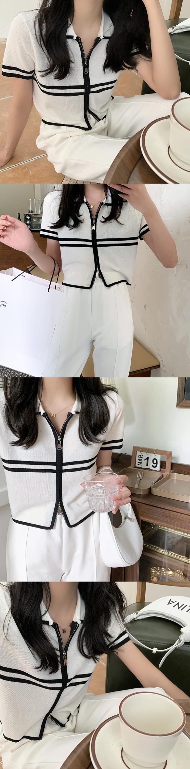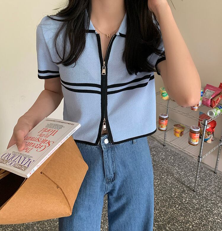 カラーストライプジッパーショートシャツ サマー薄手半袖スリーブトップス ハーフスリーブ 夏物 ビッグFスモールZ韓国69136201142