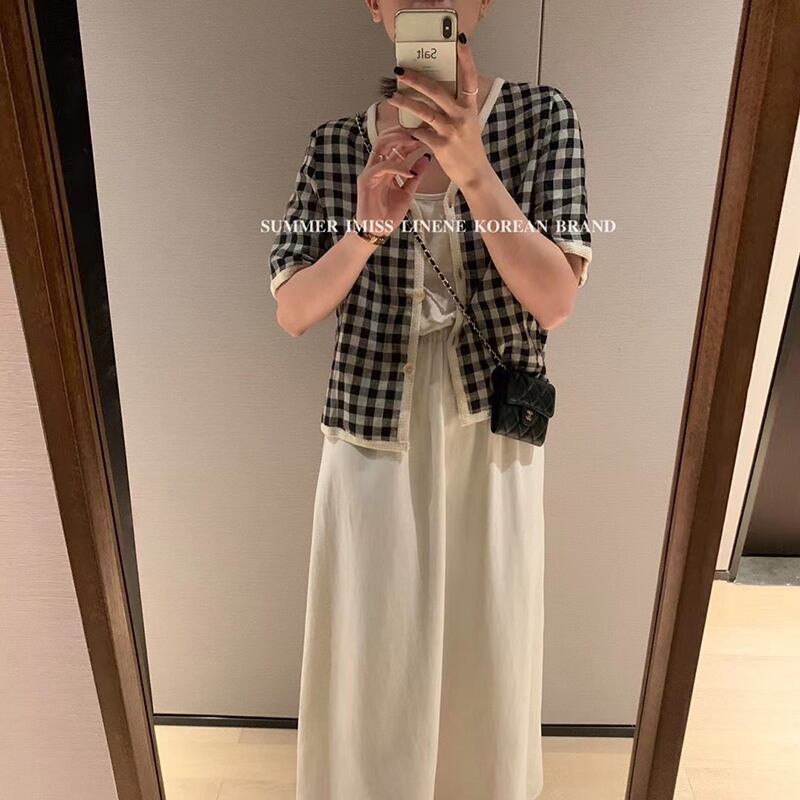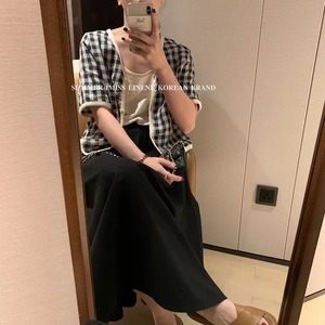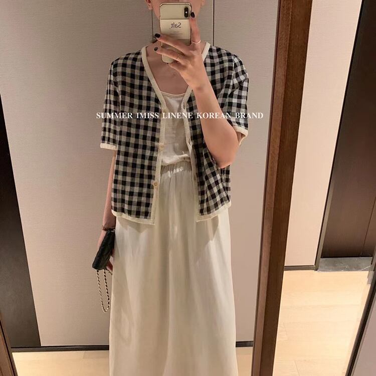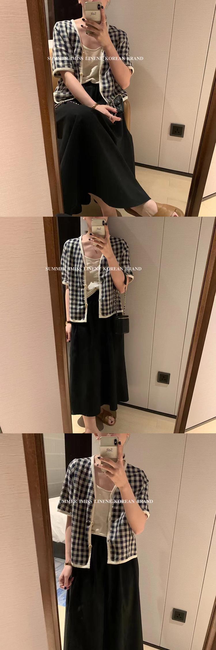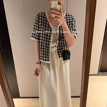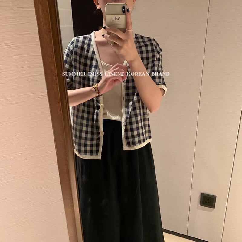 格子柄Vネック薄手ボタンショートシャツ サマー半袖スリーブジャケット ハーフスリーブ 夏物 ビッグFスモールZ韓国19109076150