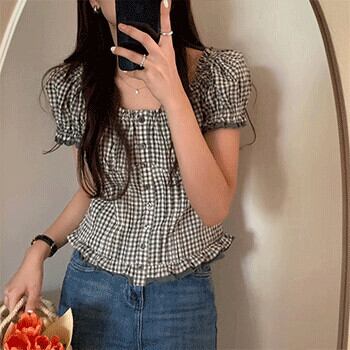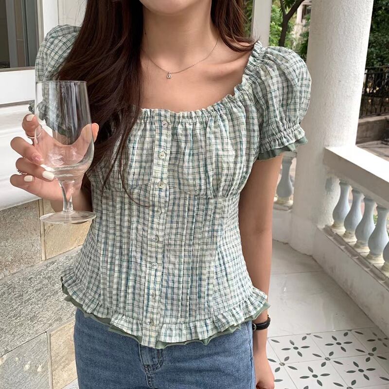 格子柄ショートシャツ サマースリムラウンドネックレース半袖スリーブトップス ハーフスリーブ 夏物 Oネック ビッグFスモールZ韓国94217975957
