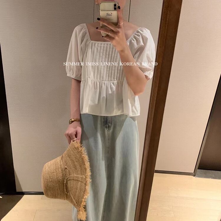 スリーブプリーツシャツ サマースタイルカラーソリッド 半袖トップス ショート ハーフスリーブ 夏物 ソリッドカラー スクウェア ビッグFスモールZ韓国10695205467