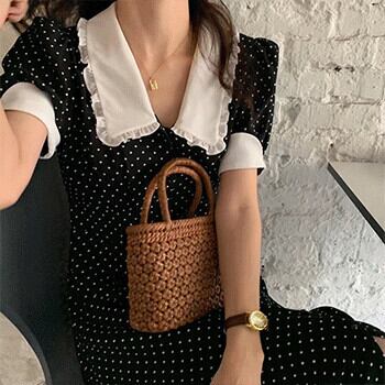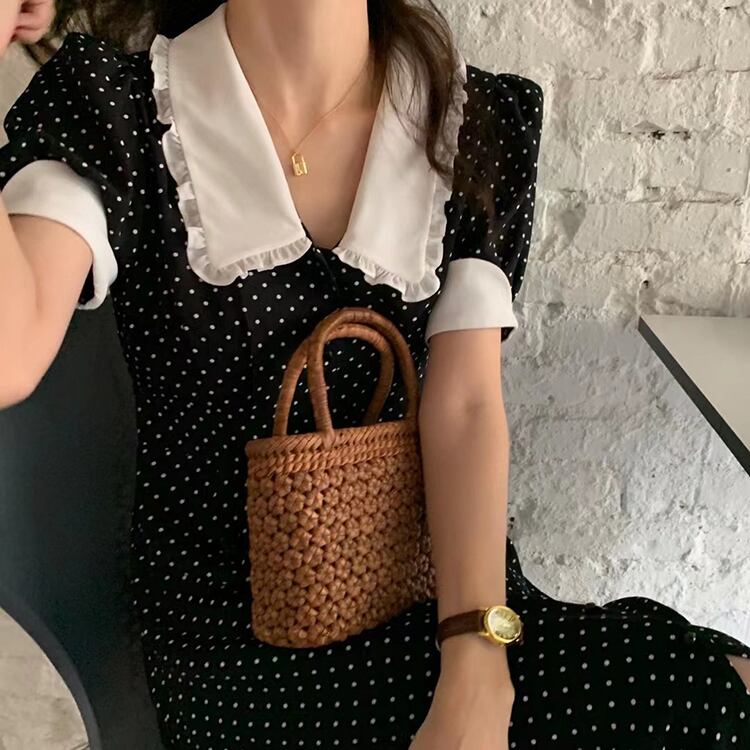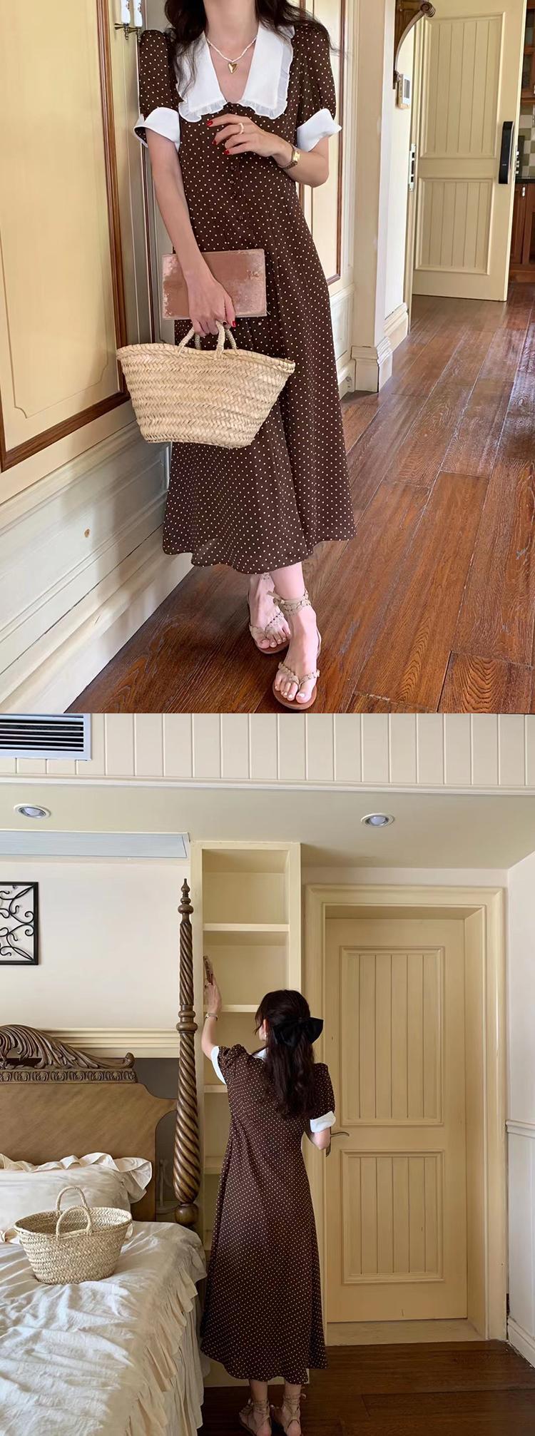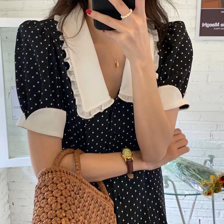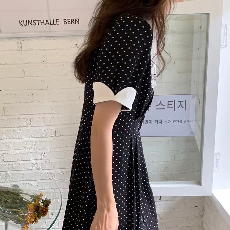 スタンダード水玉カラードレス サマースタイルスリーブハイウェストウェストロングスカート レトロ 夏物 ビッグFスモールZ韓国44876510939