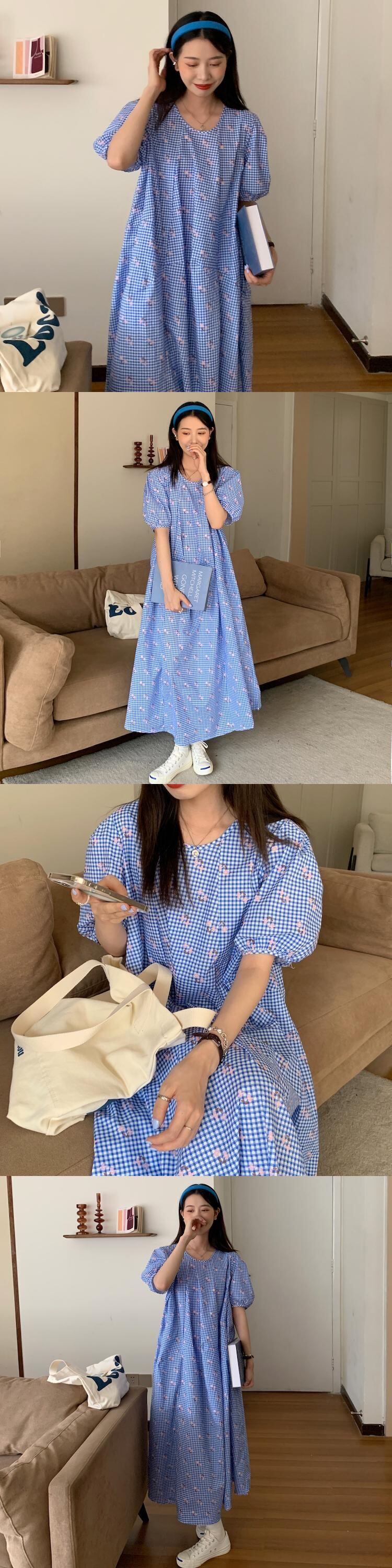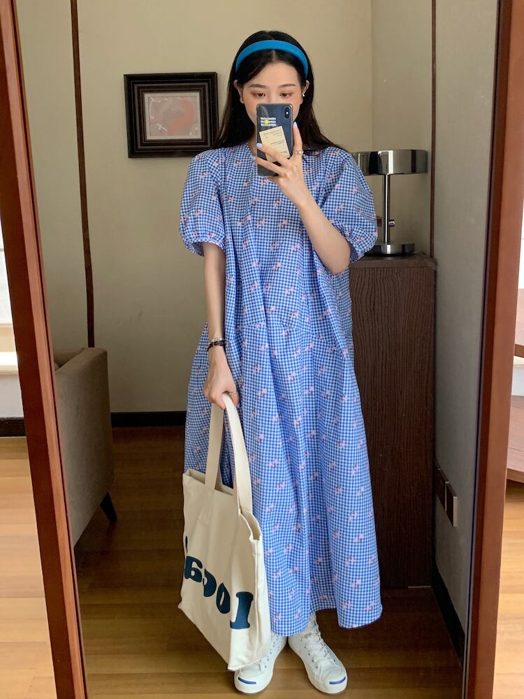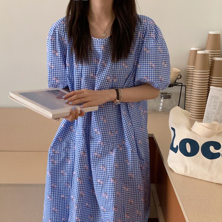 スリーブドレス サマーフローラルラウンドネックミディ 夏物 花柄 Oネック ビッグFスモールZ韓国21624490538
