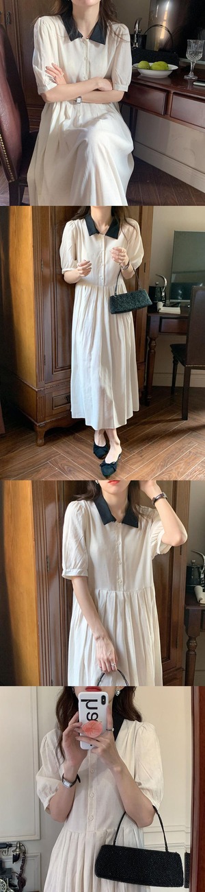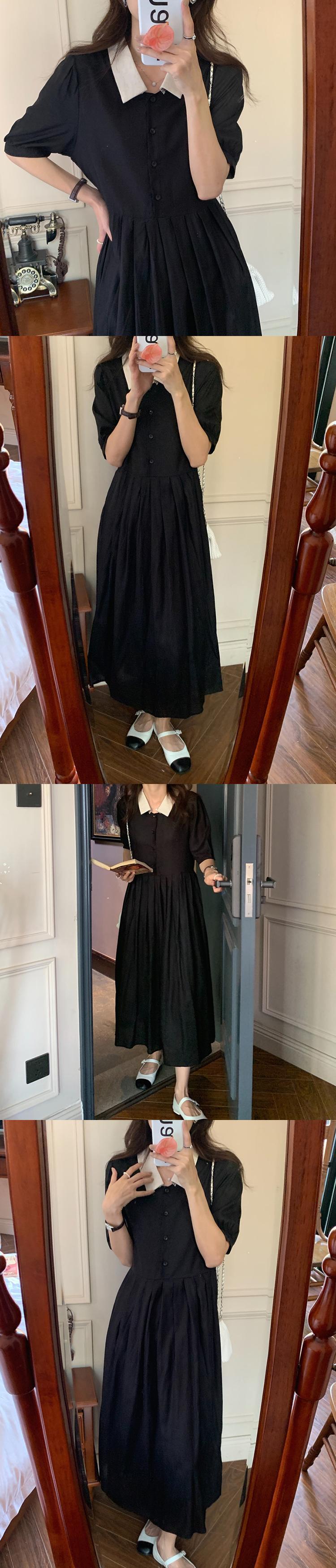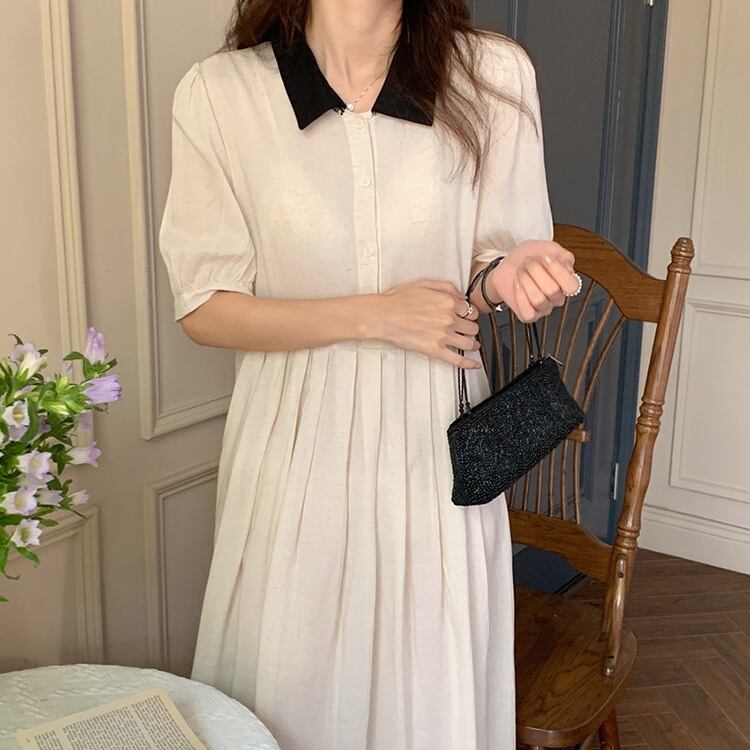 スリーブカラープリーツドレス サマー薄手Aラインハイウェストロングスカート 夏物 ビッグFスモールZ韓国6168450166