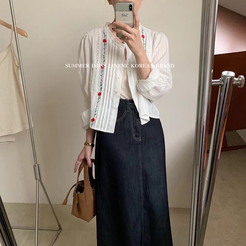 ホワイトプリーツカーディガンジャケット サマースタイルレースラウンドネック薄手 ロング レッド 刺繍 夏物 Oネック ビッグFスモールZ韓国56062545929