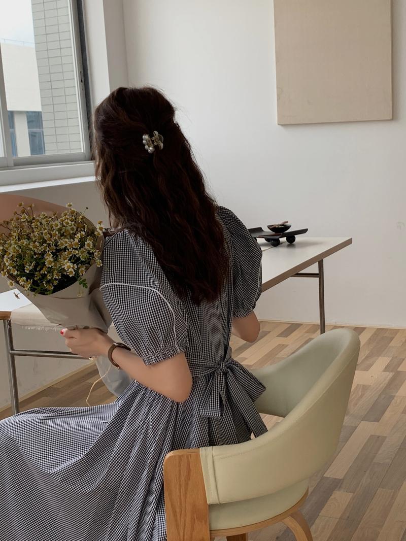 ネイビー格子柄ドレス サマースタイルスリムスリーブ 夏物 ビッグFスモールZ韓国97407788955