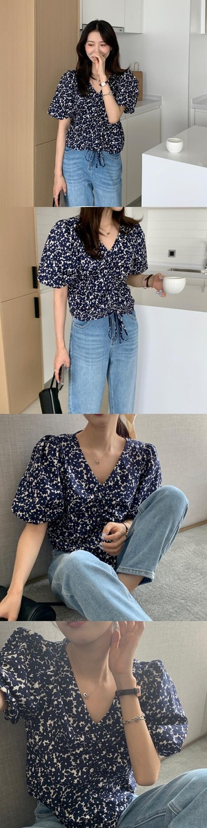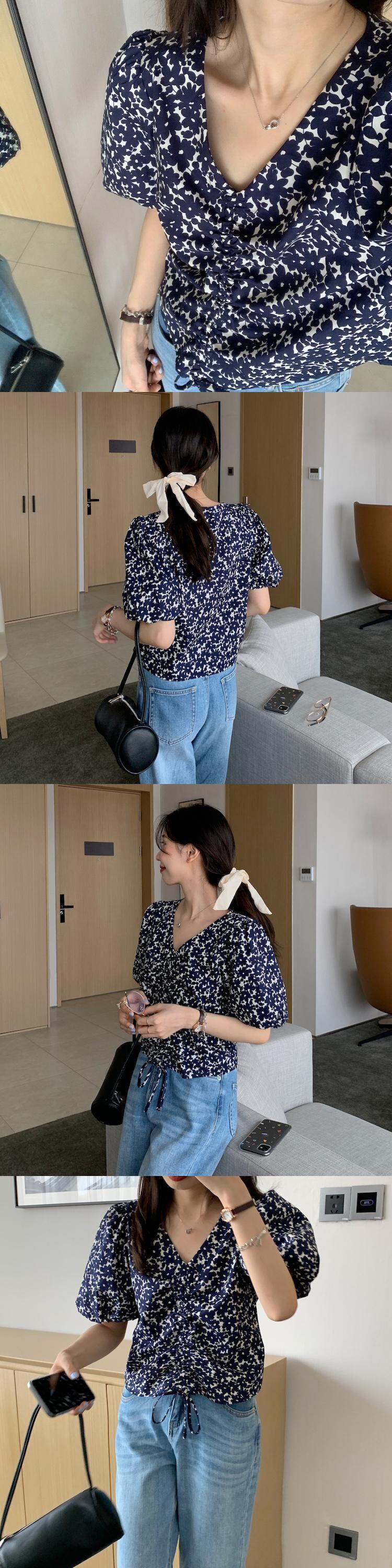 スリーブプリント柄ギャザーシャツ サマーVネック半袖ルーズスリムトップス ショート ランタンスリーブ ハーフスリーブ 夏物 ビッグFスモールZ韓国58243425746